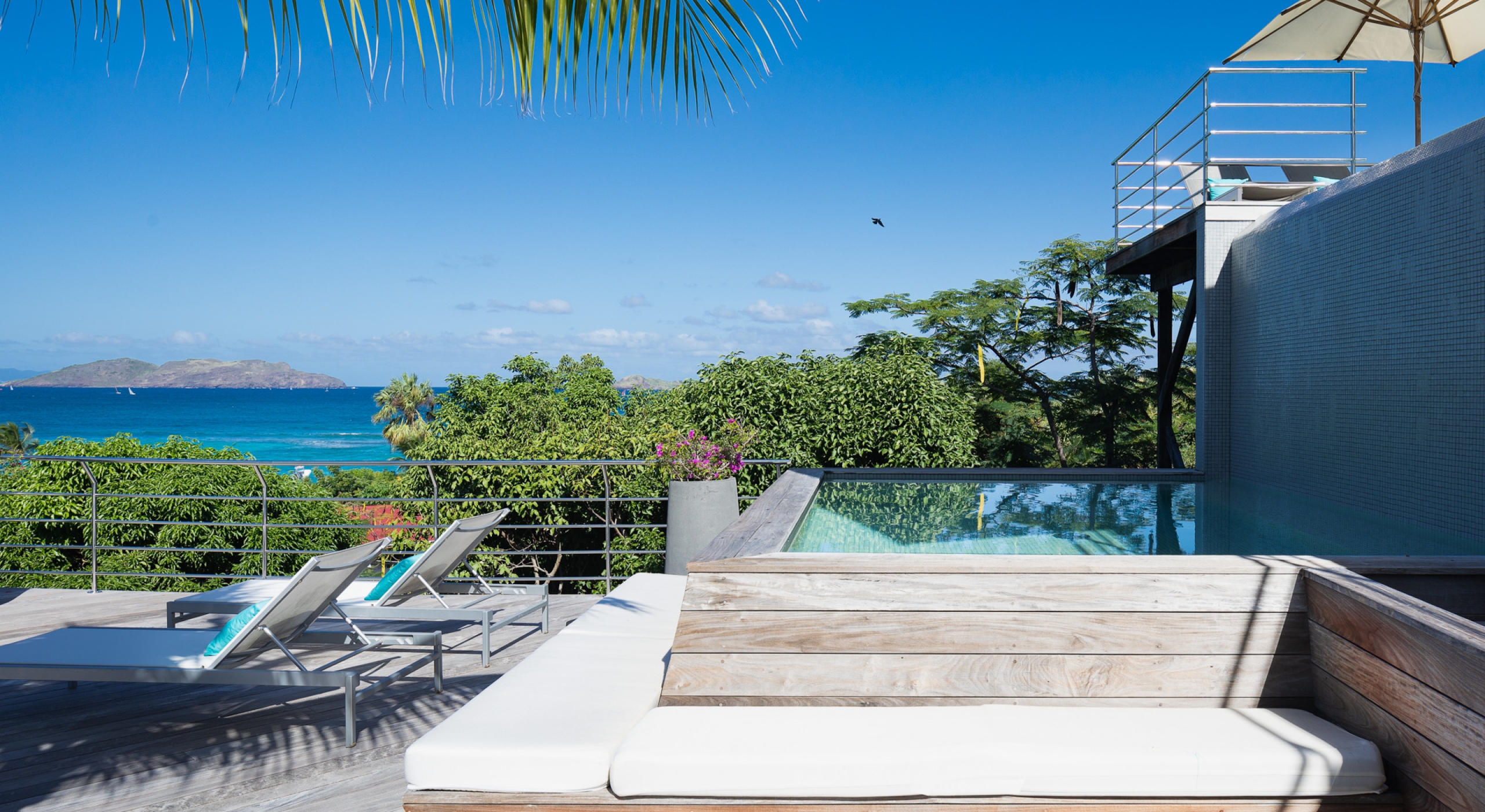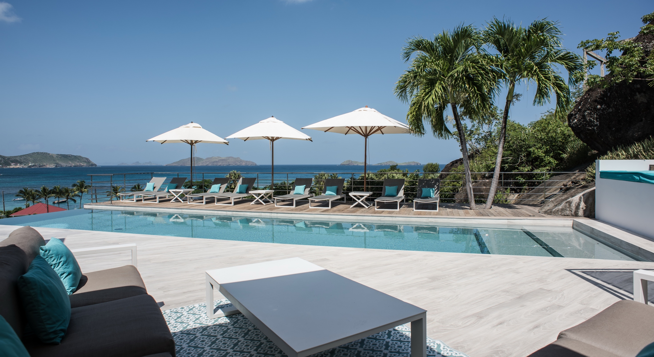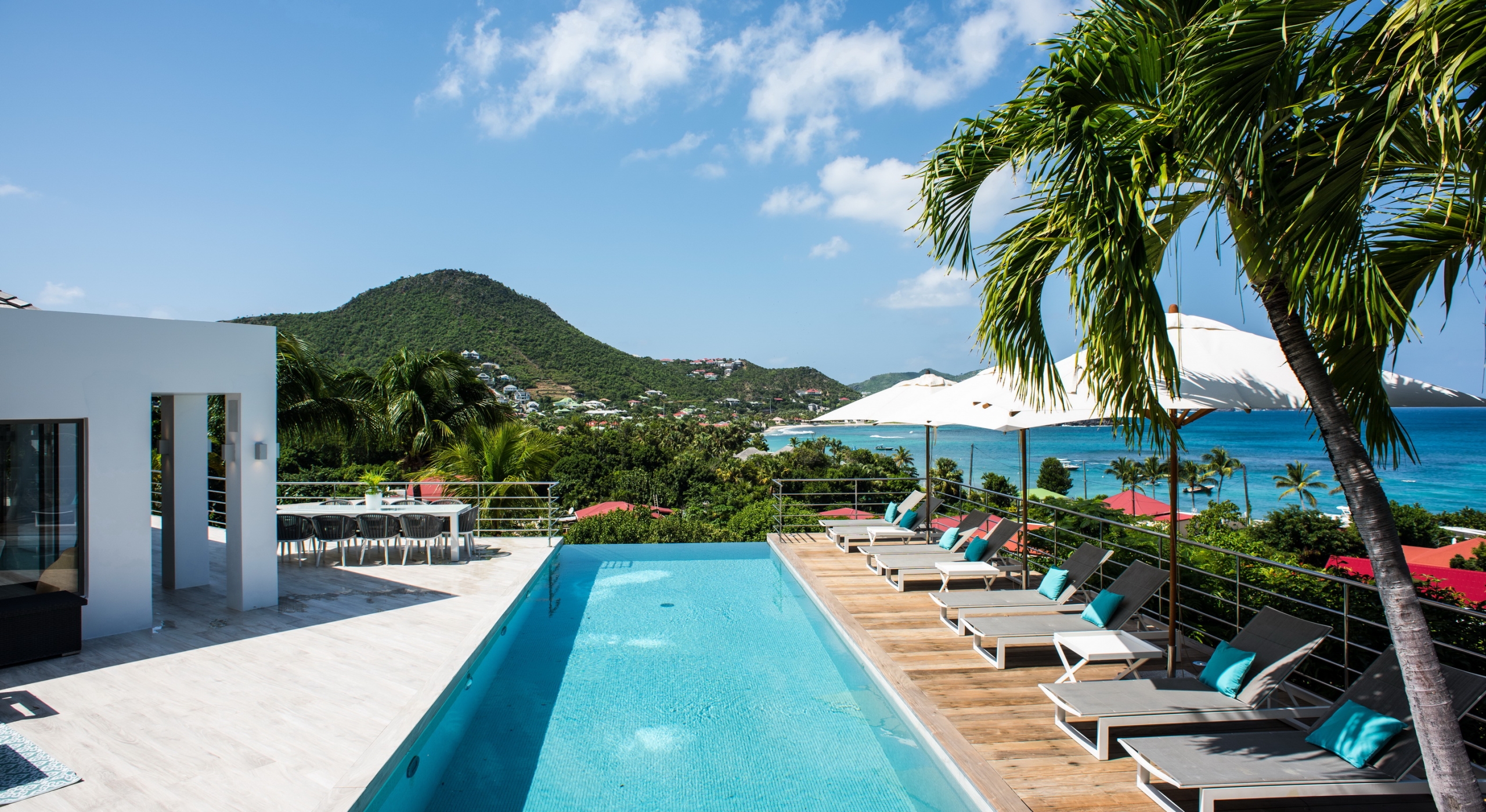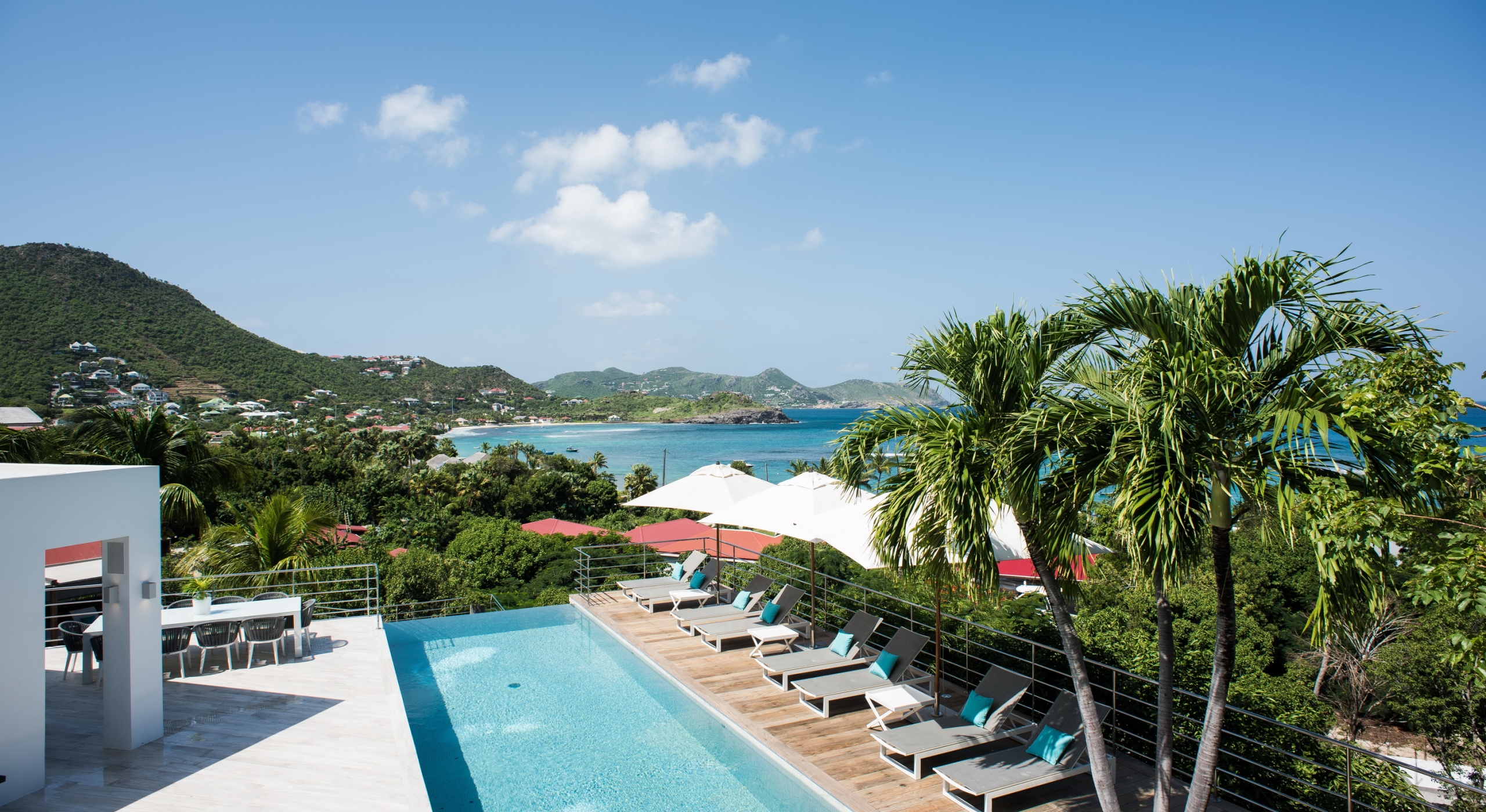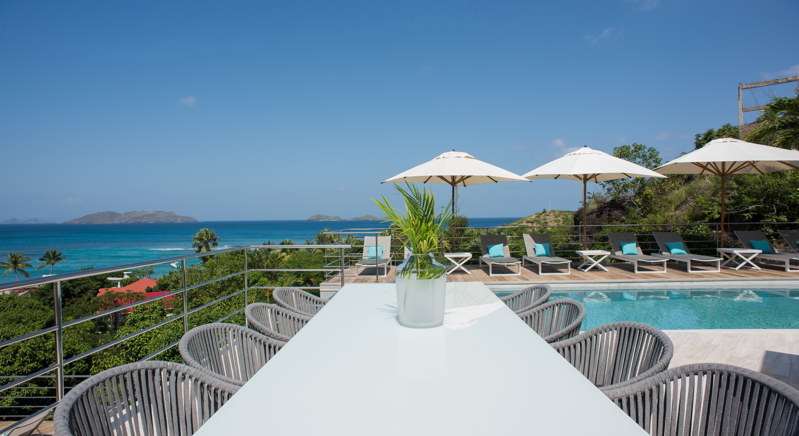 This contemporary chic villa has everything you could need for your next vacations on the island: a long heated infinity pool, a sunny terrace, large bedroom each facing the sea, a gourmet kitchen…