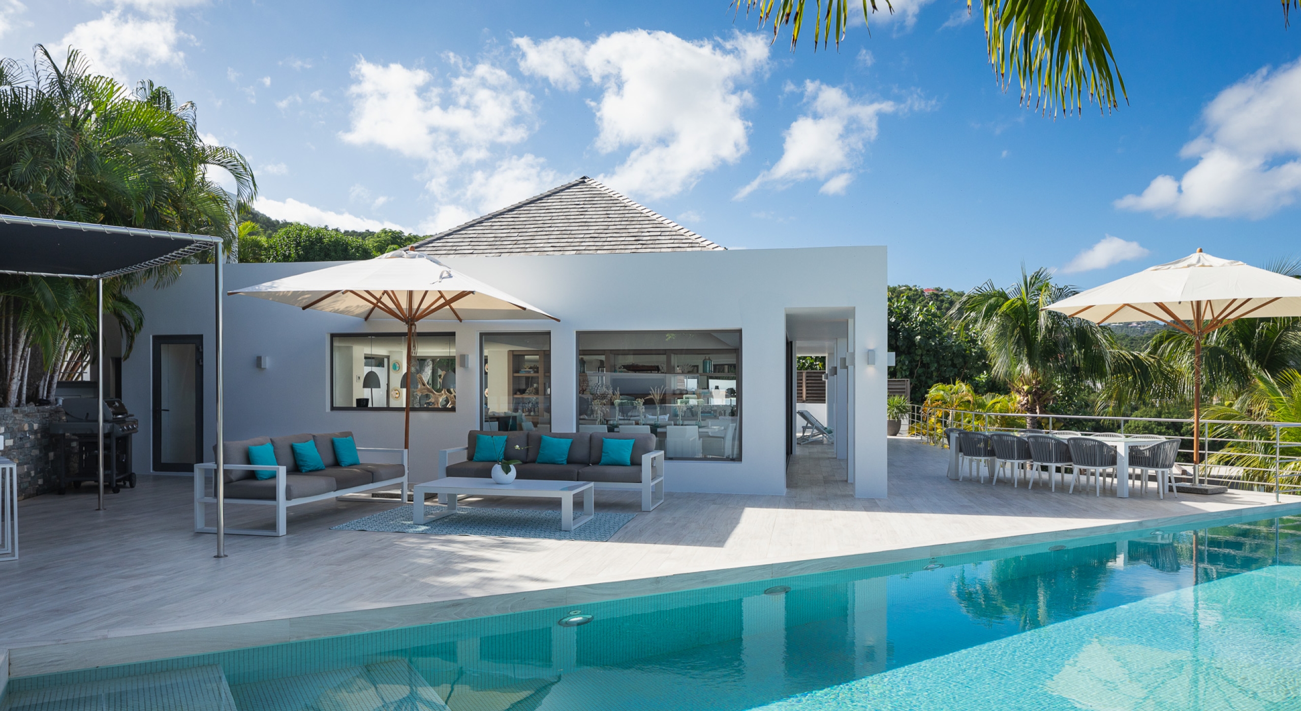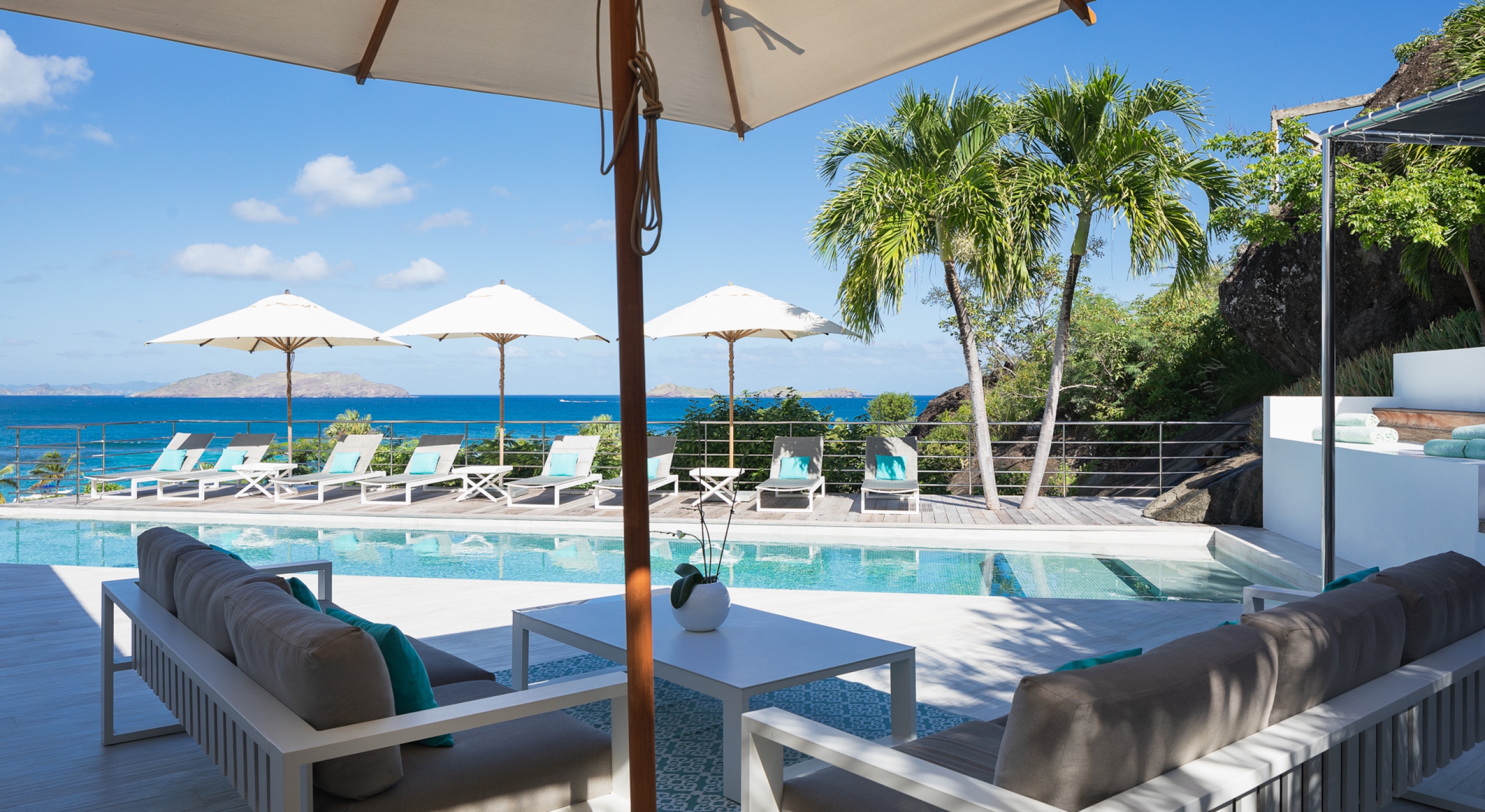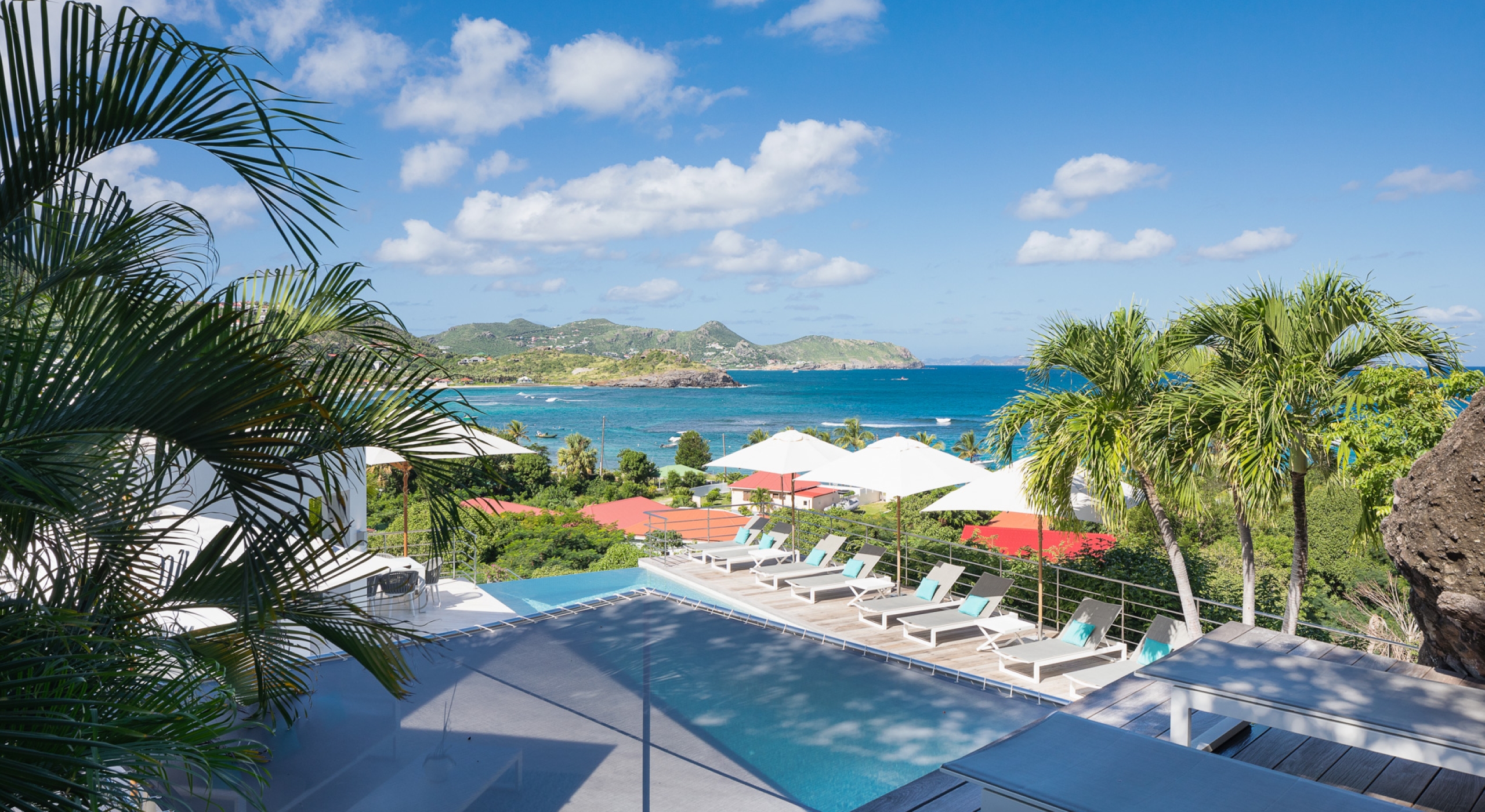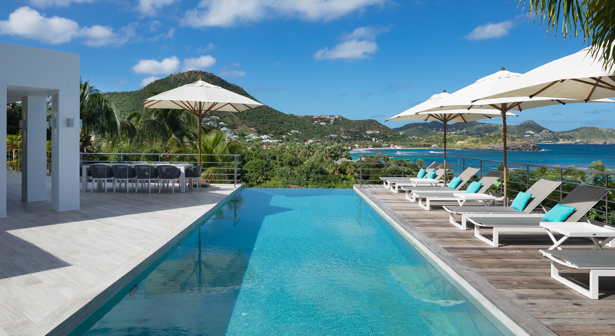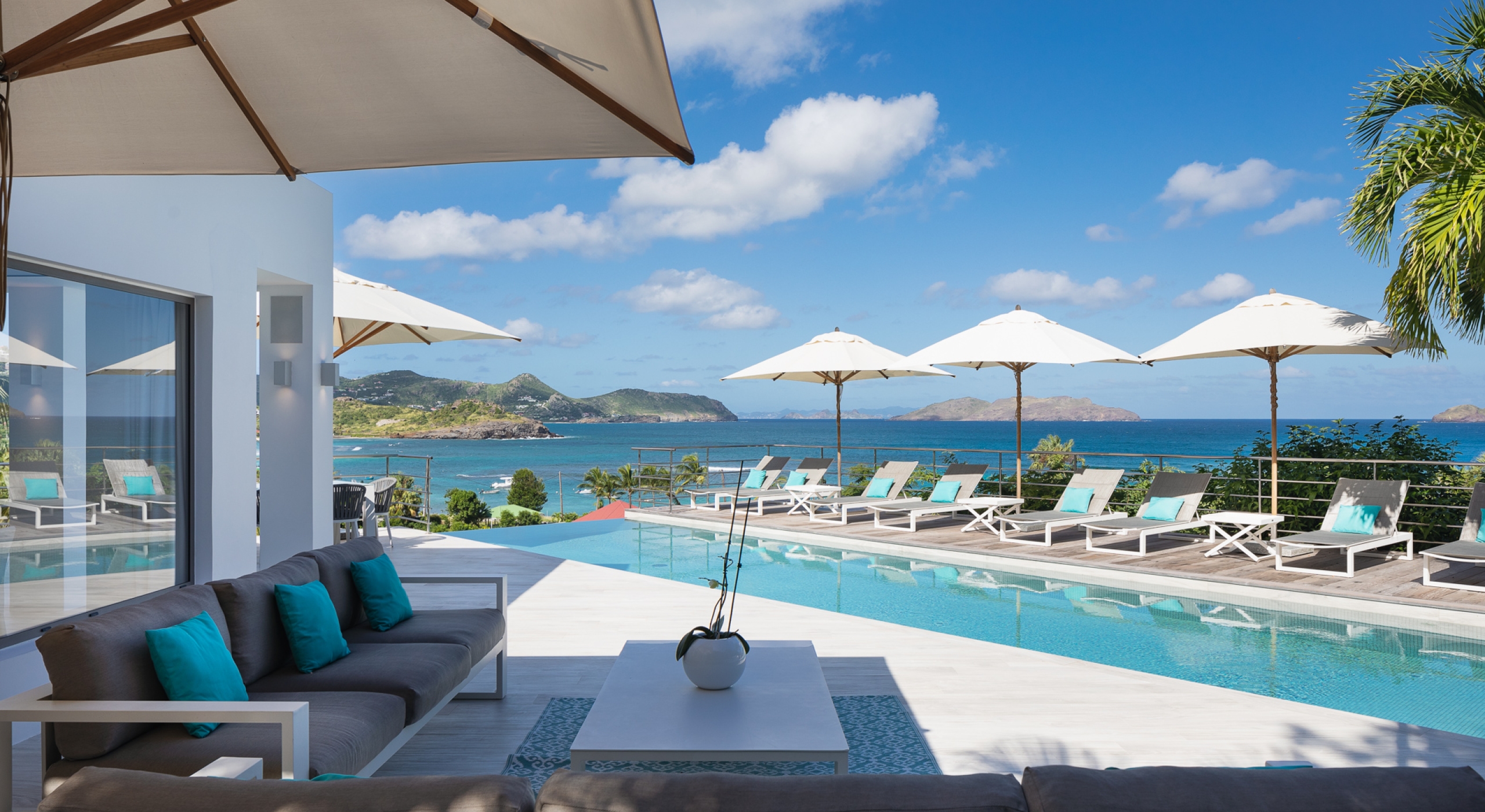 This contemporary chic villa has everything you could need for your next vacations on the island: a long heated infinity pool, a sunny terrace, large bedroom each facing the sea, a gourmet kitchen…