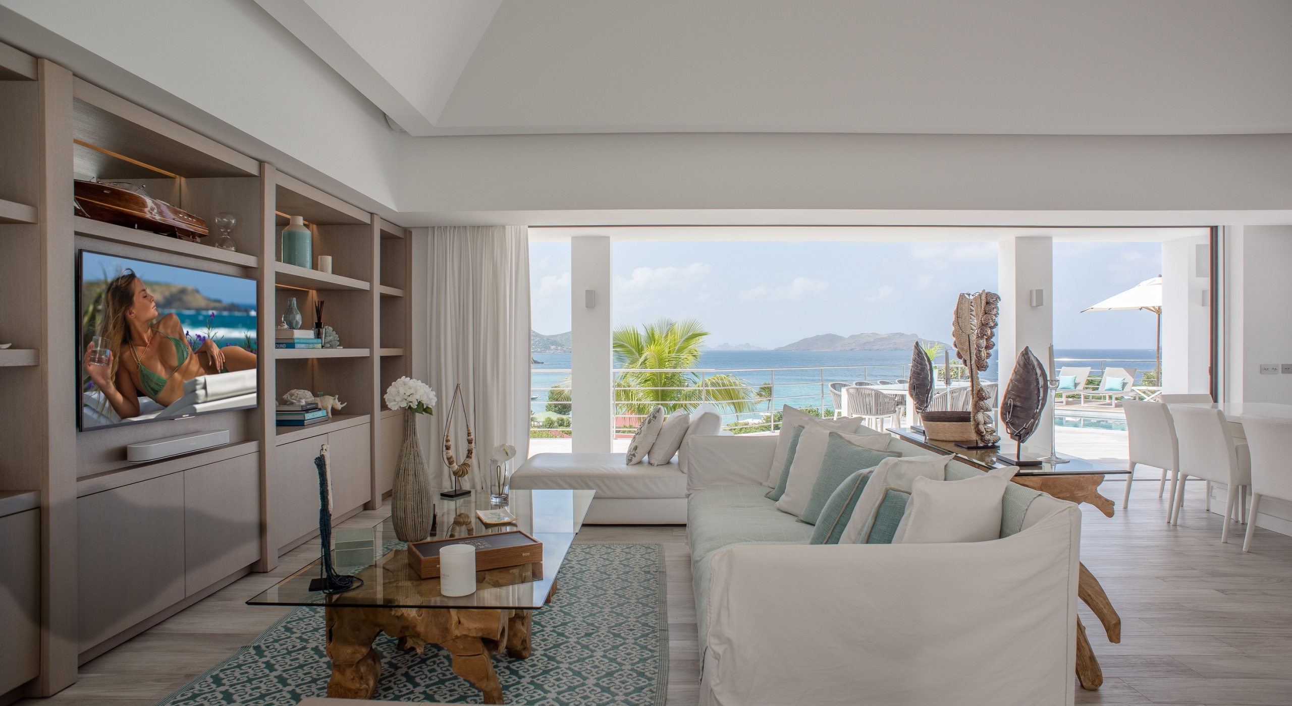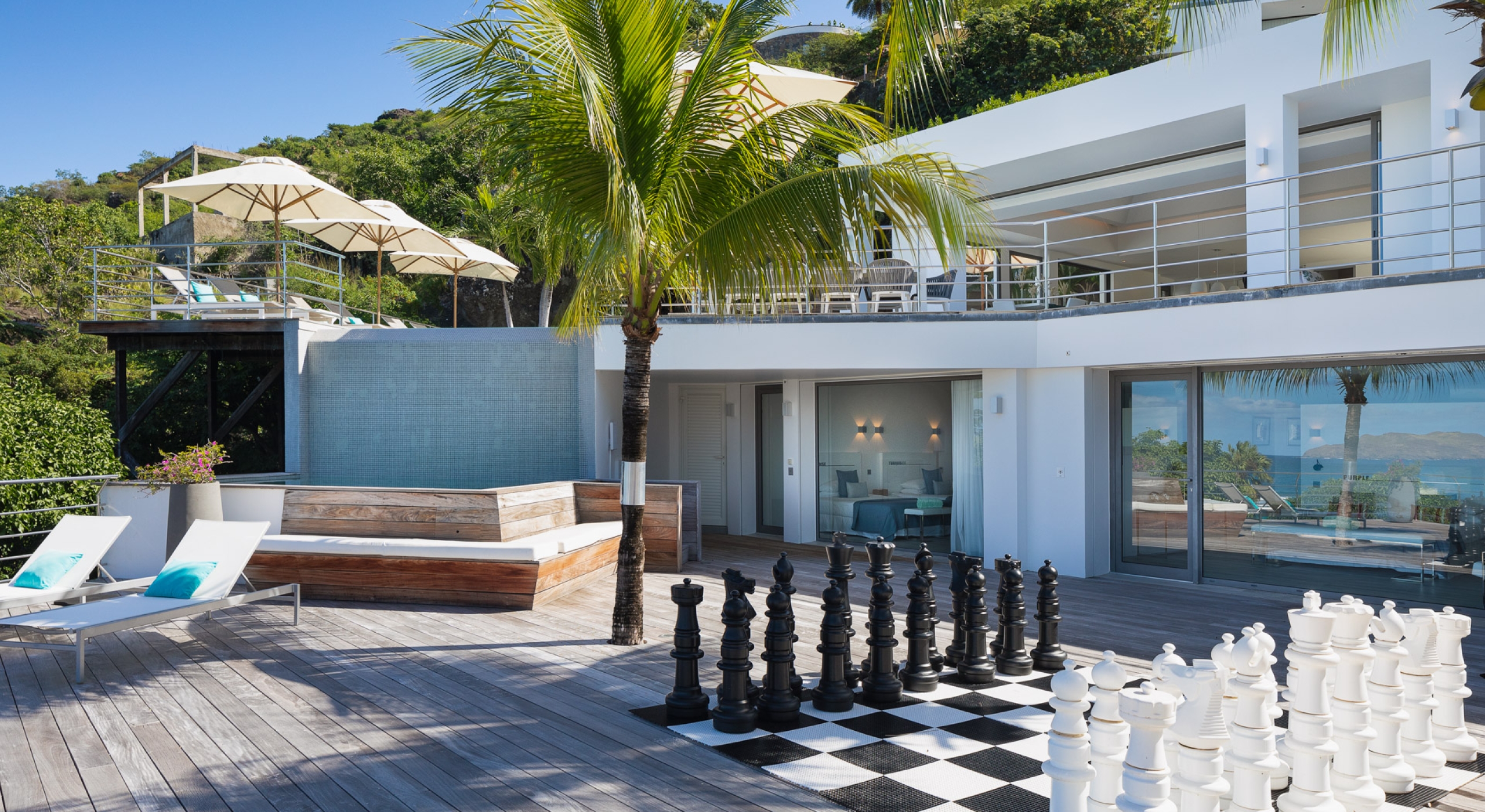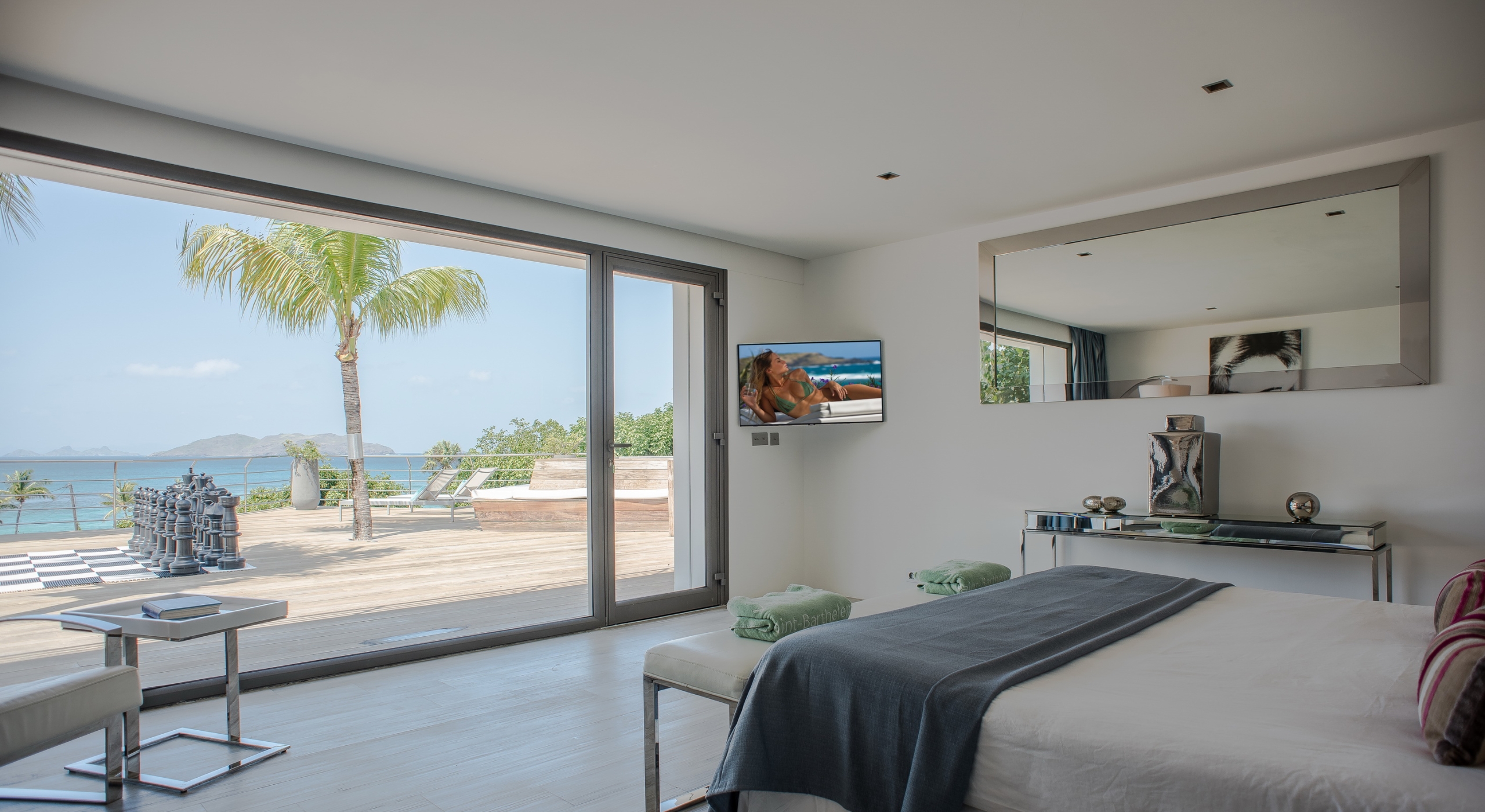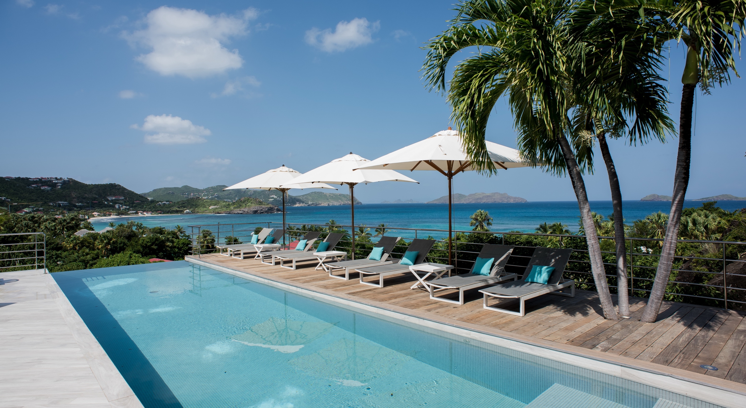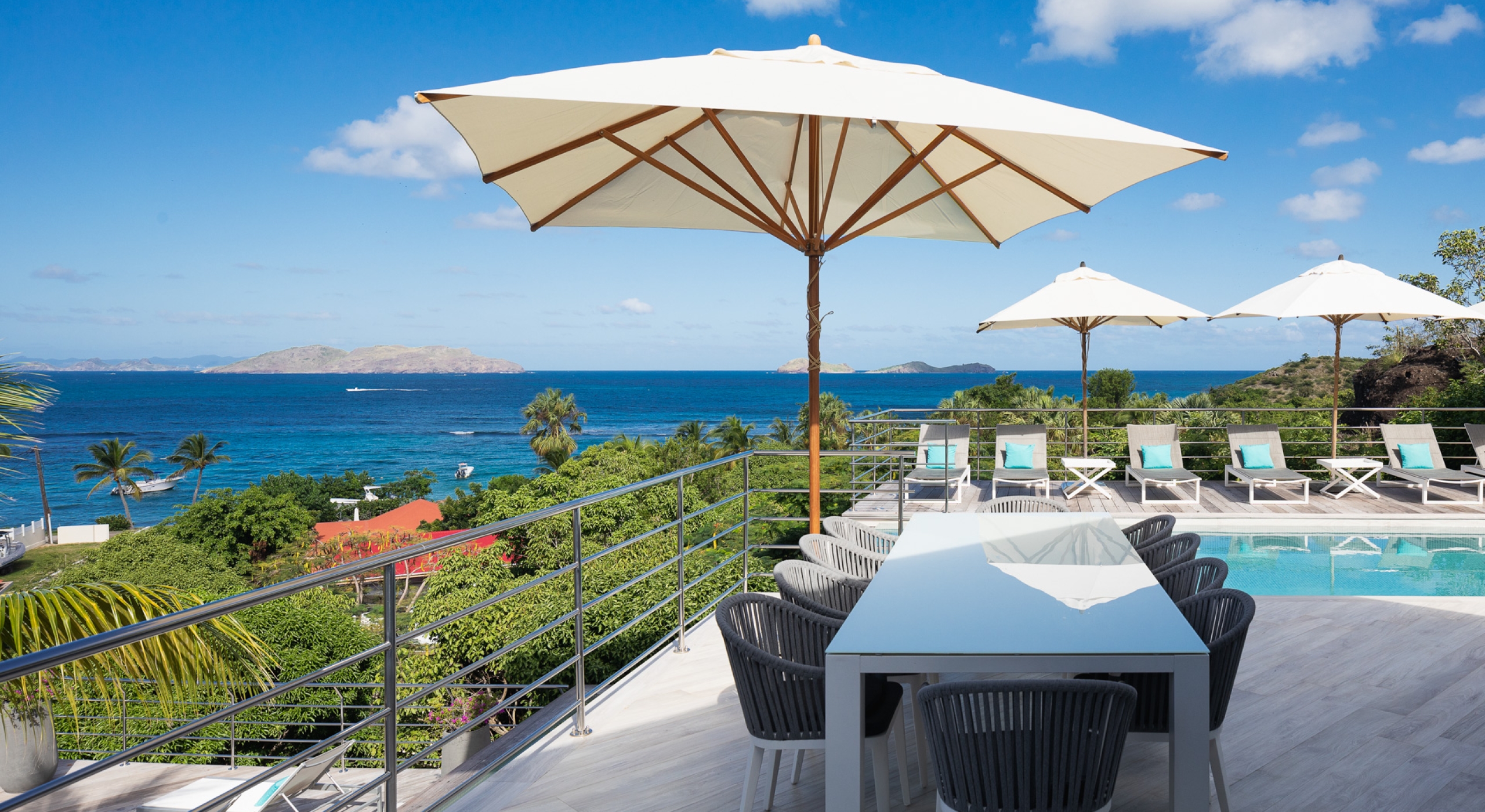 This contemporary chic villa has everything you could need for your next vacations on the island: a long heated infinity pool, a sunny terrace, large bedroom each facing the sea, a gourmet kitchen…