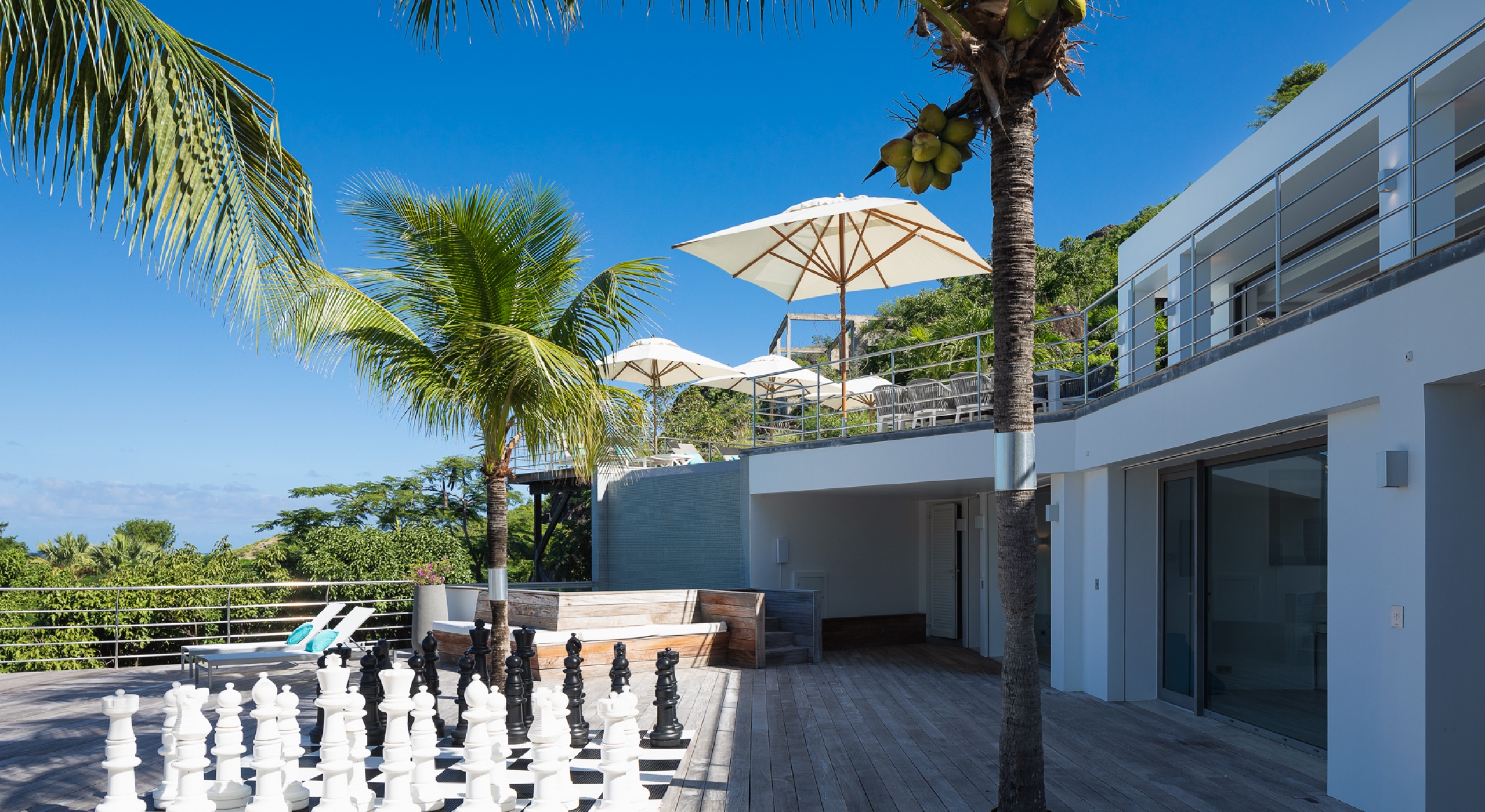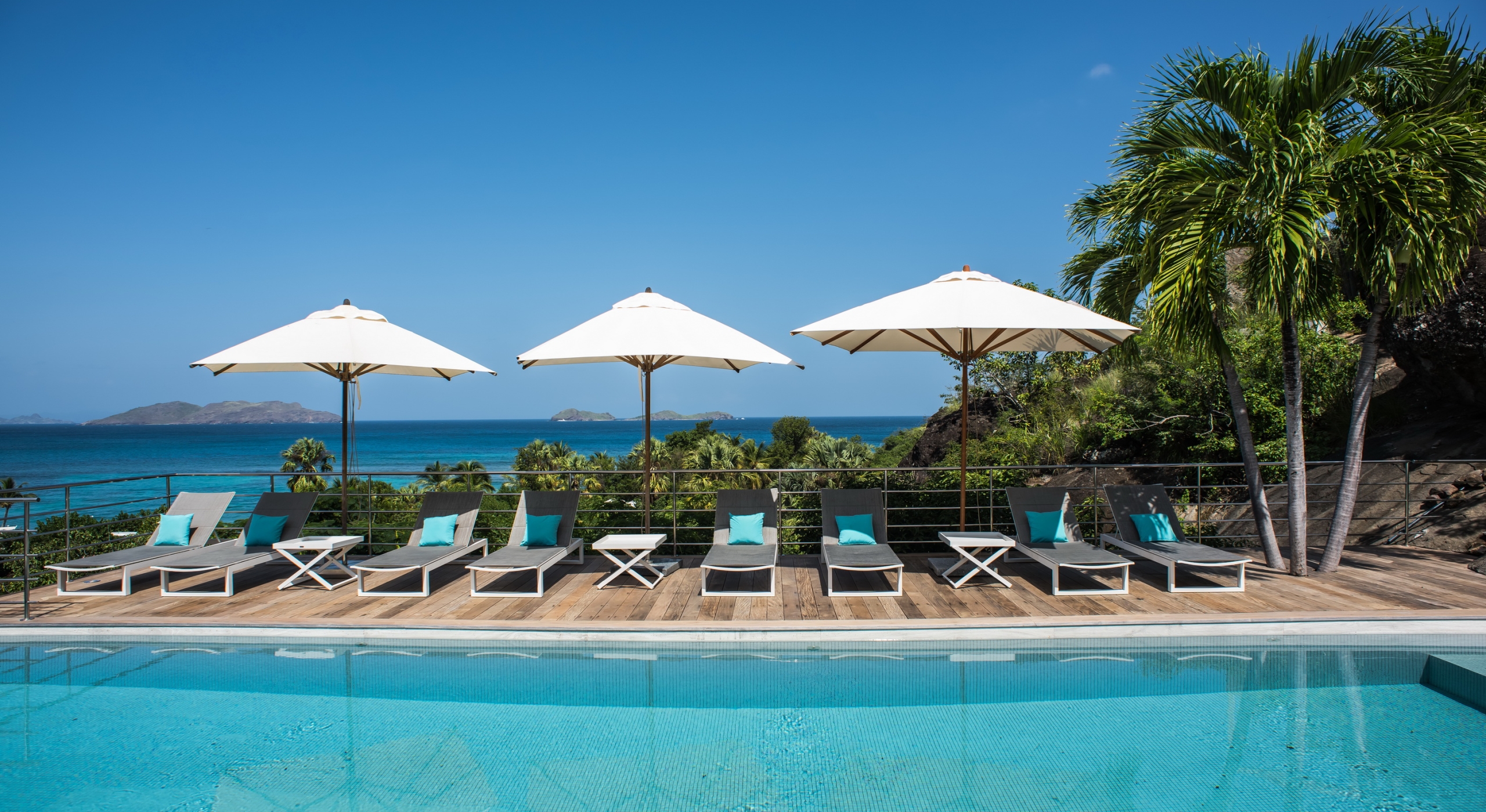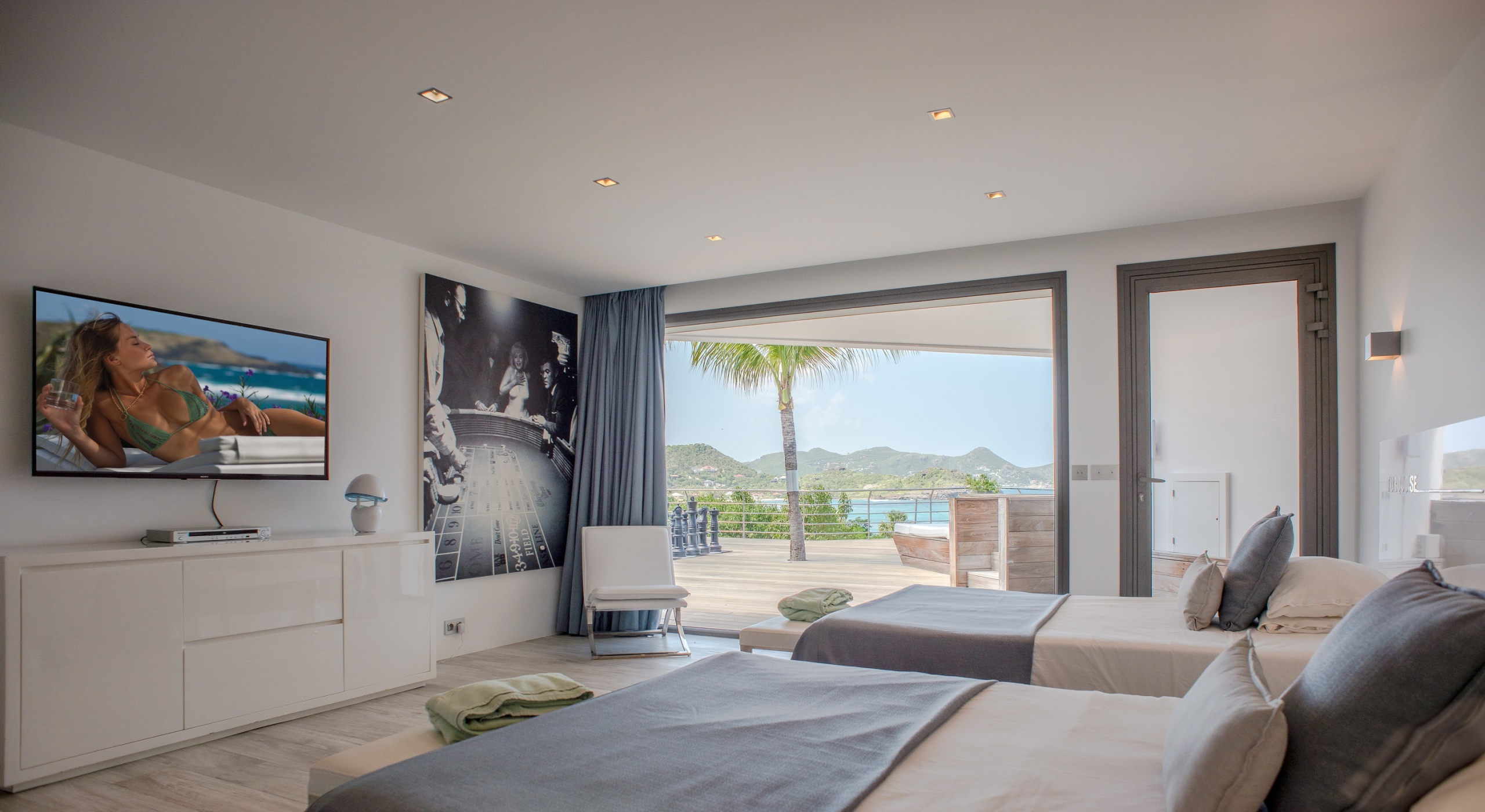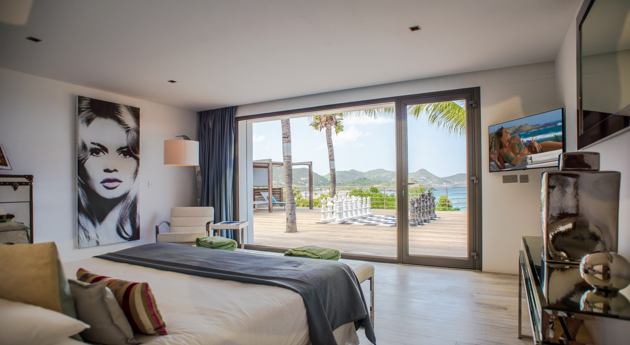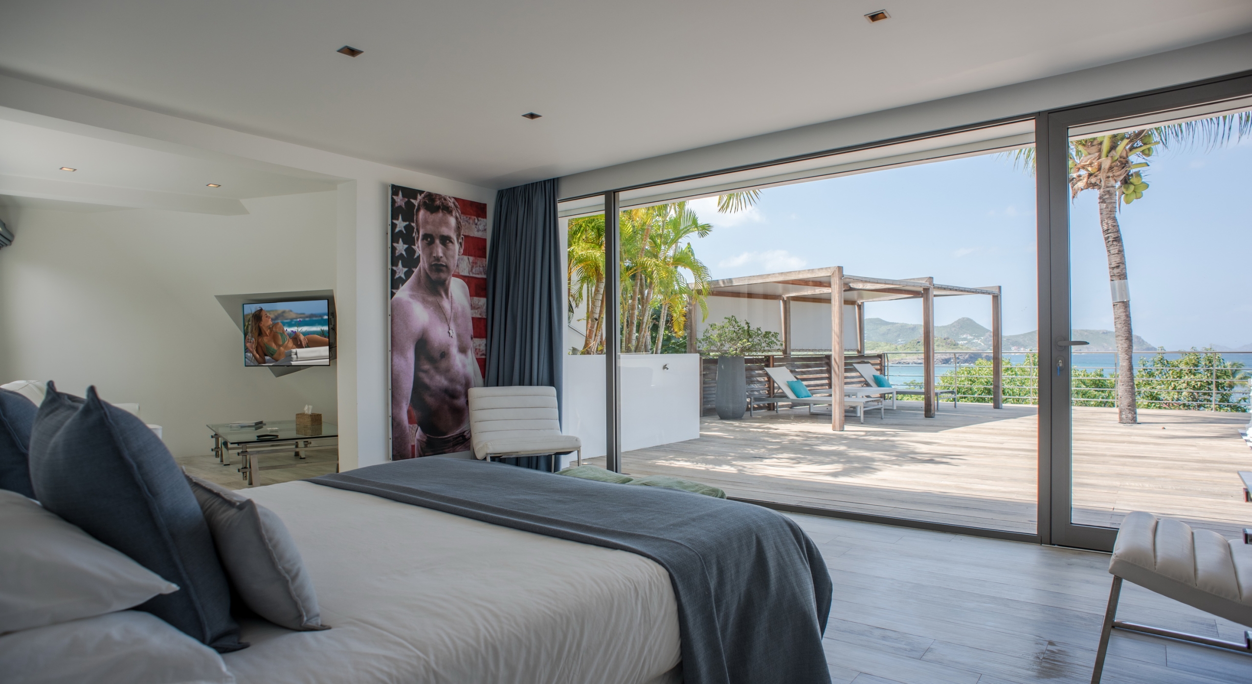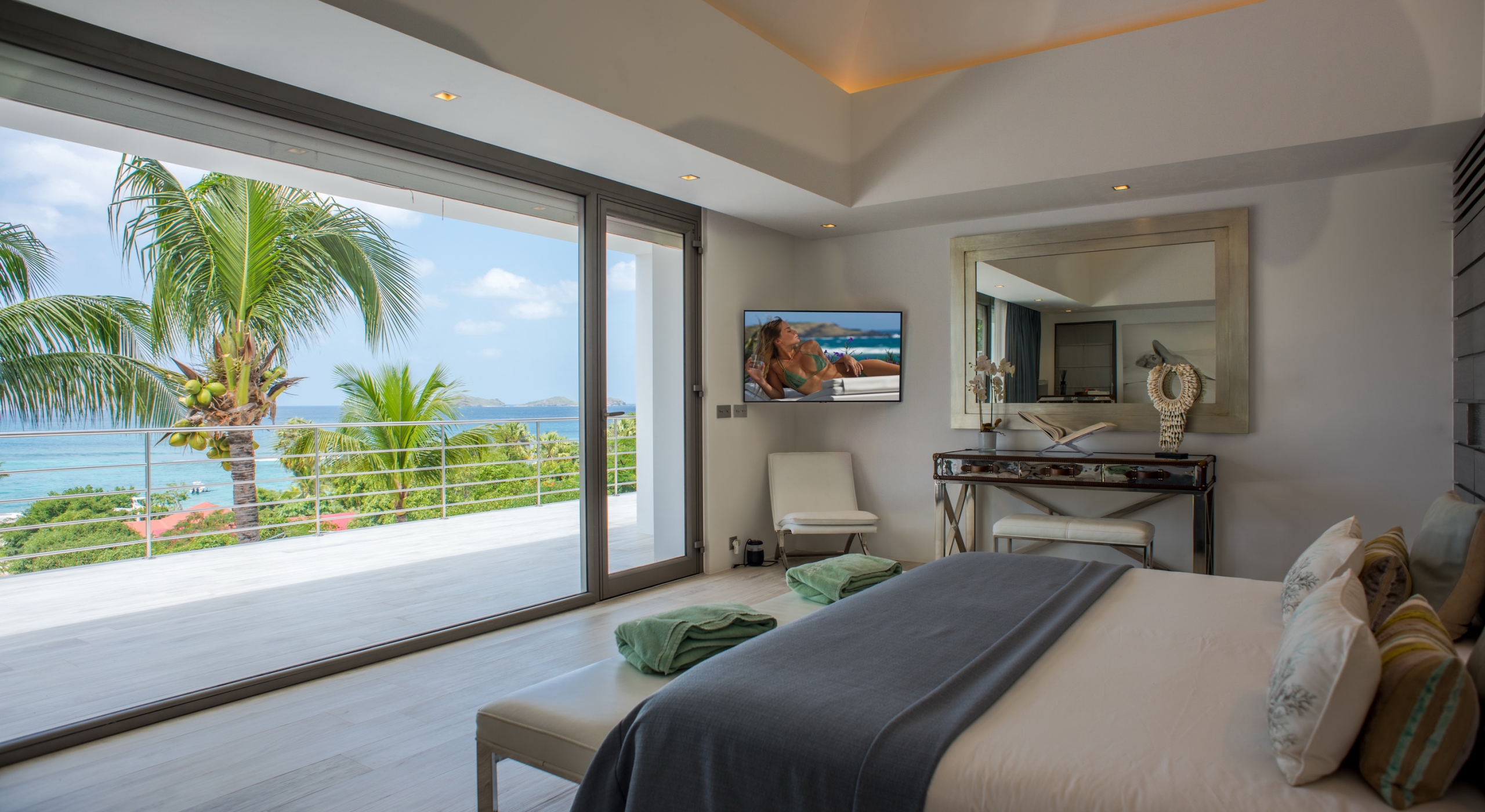 This contemporary chic villa has everything you could need for your next vacations on the island: a long heated infinity pool, a sunny terrace, large bedroom each facing the sea, a gourmet kitchen…