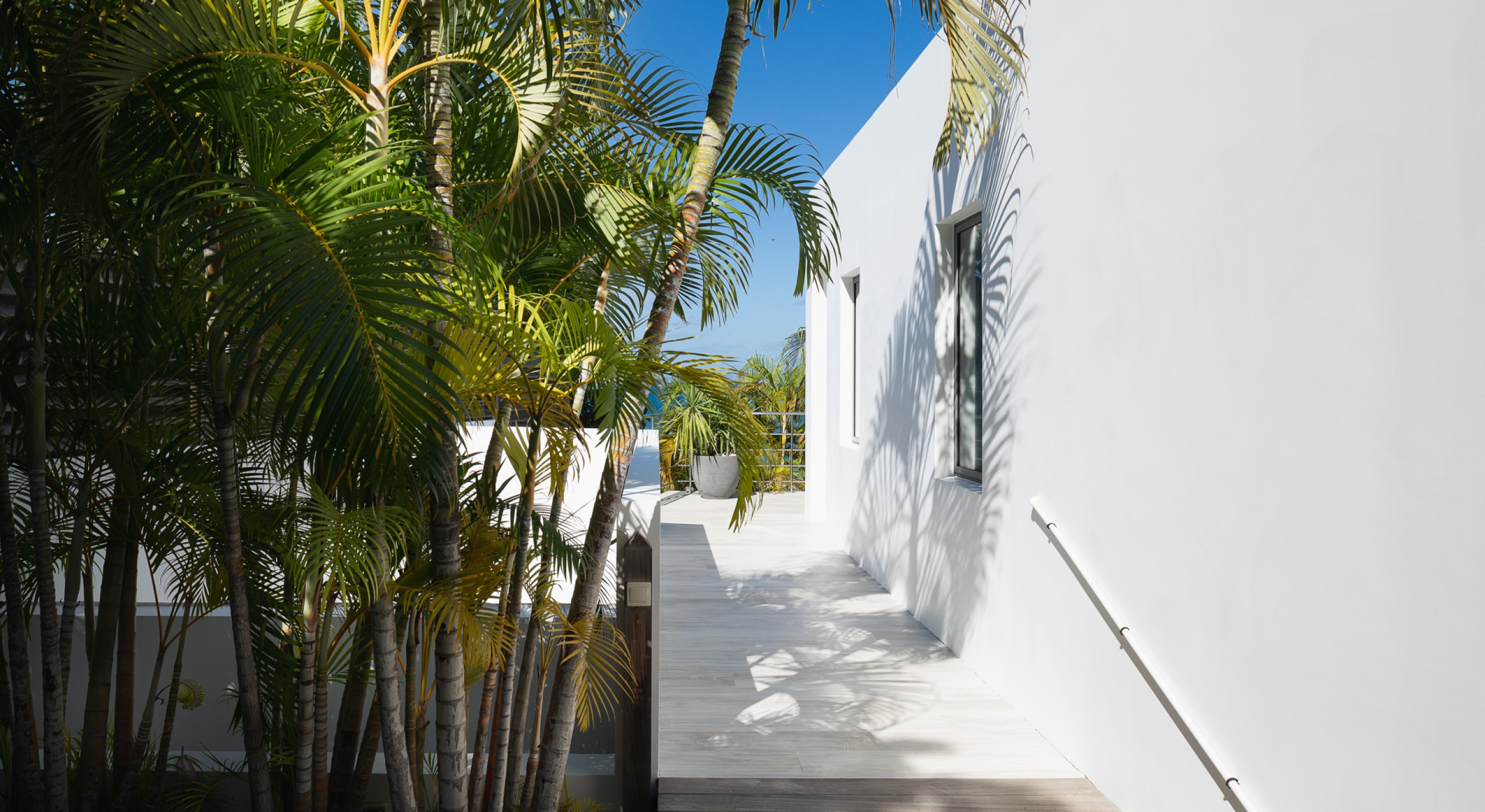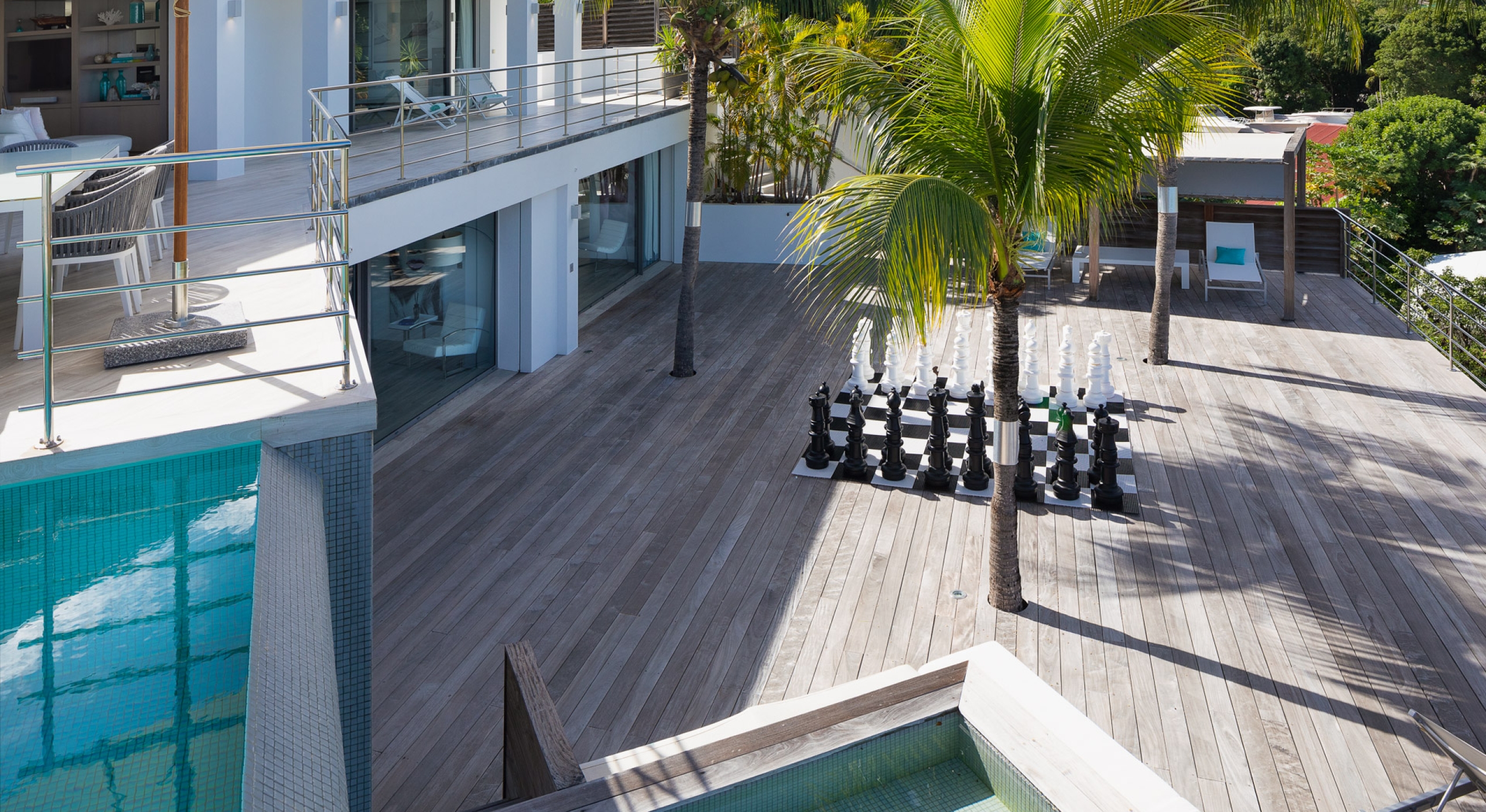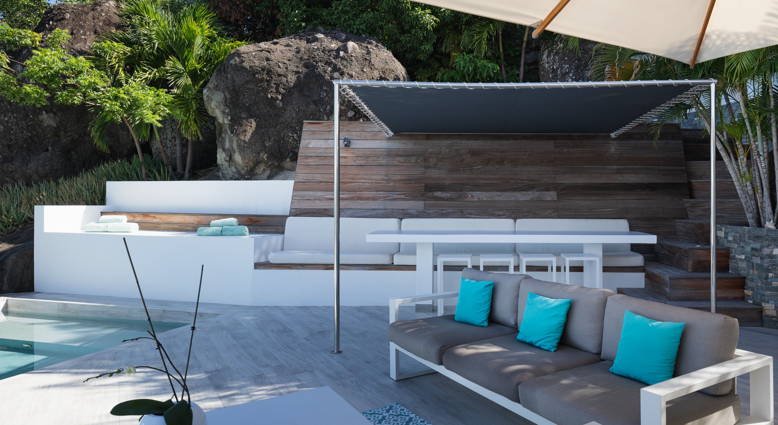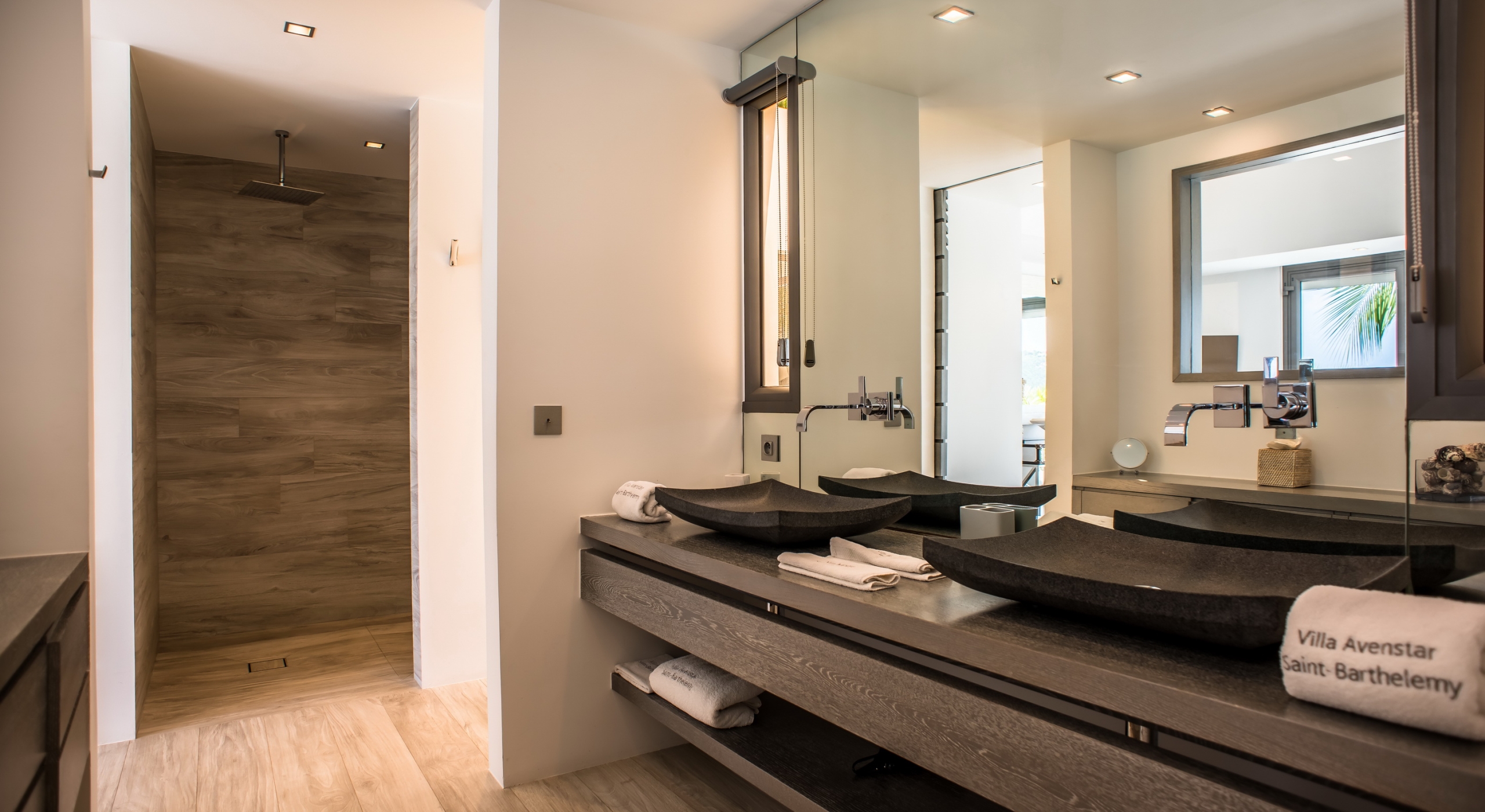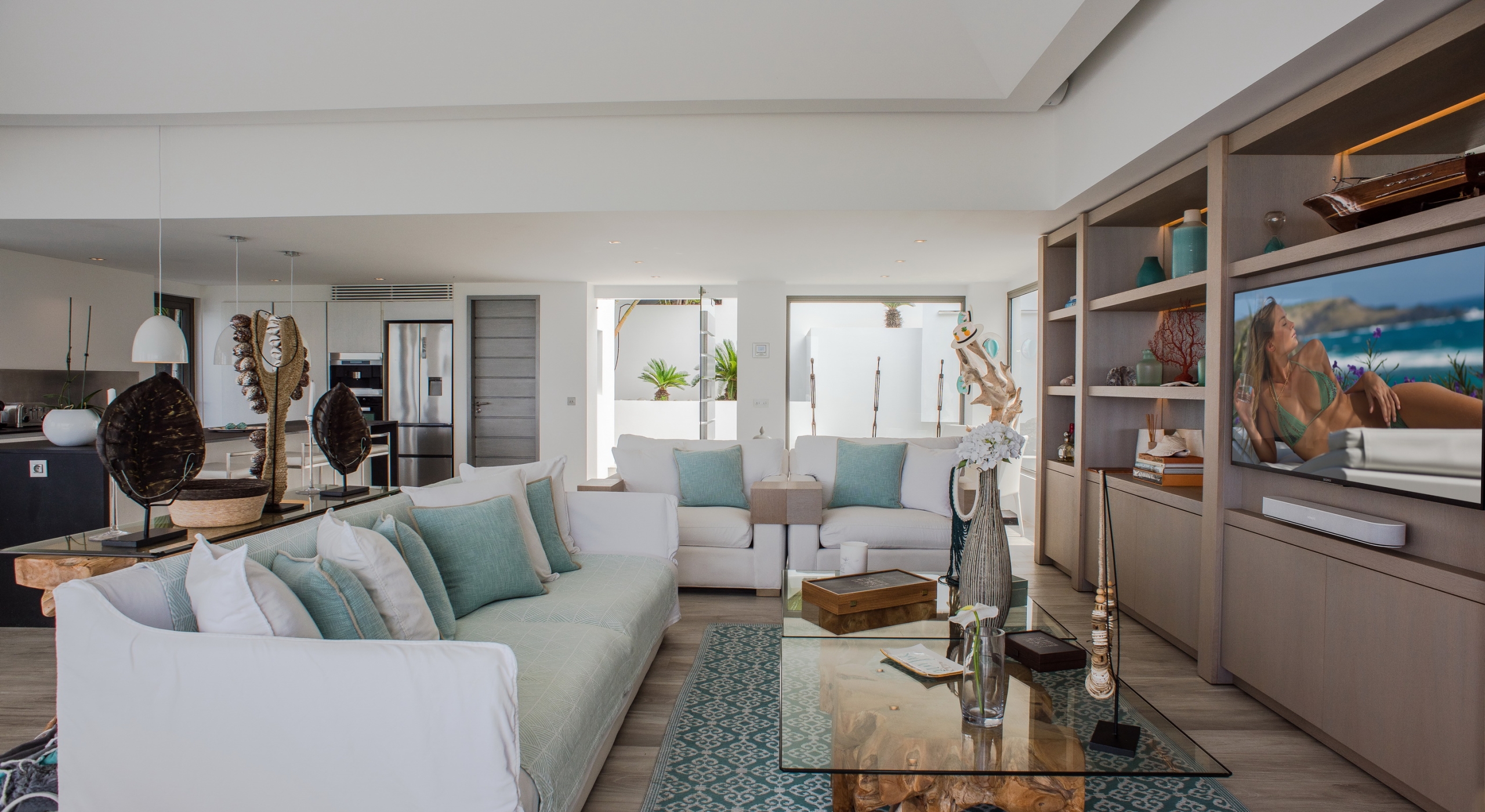 This contemporary chic villa has everything you could need for your next vacations on the island: a long heated infinity pool, a sunny terrace, large bedroom each facing the sea, a gourmet kitchen…