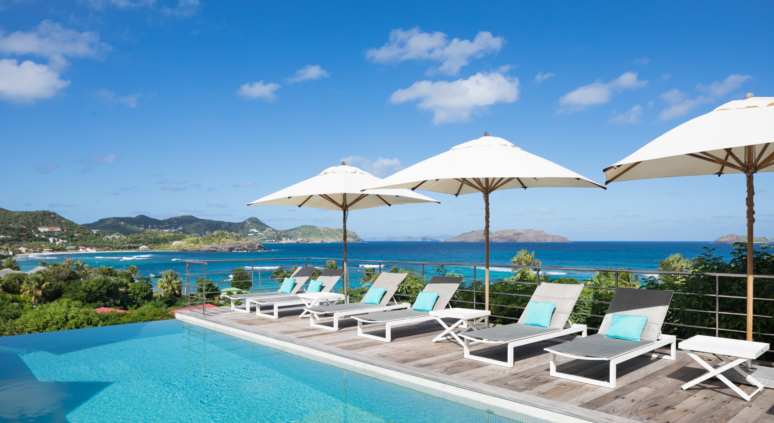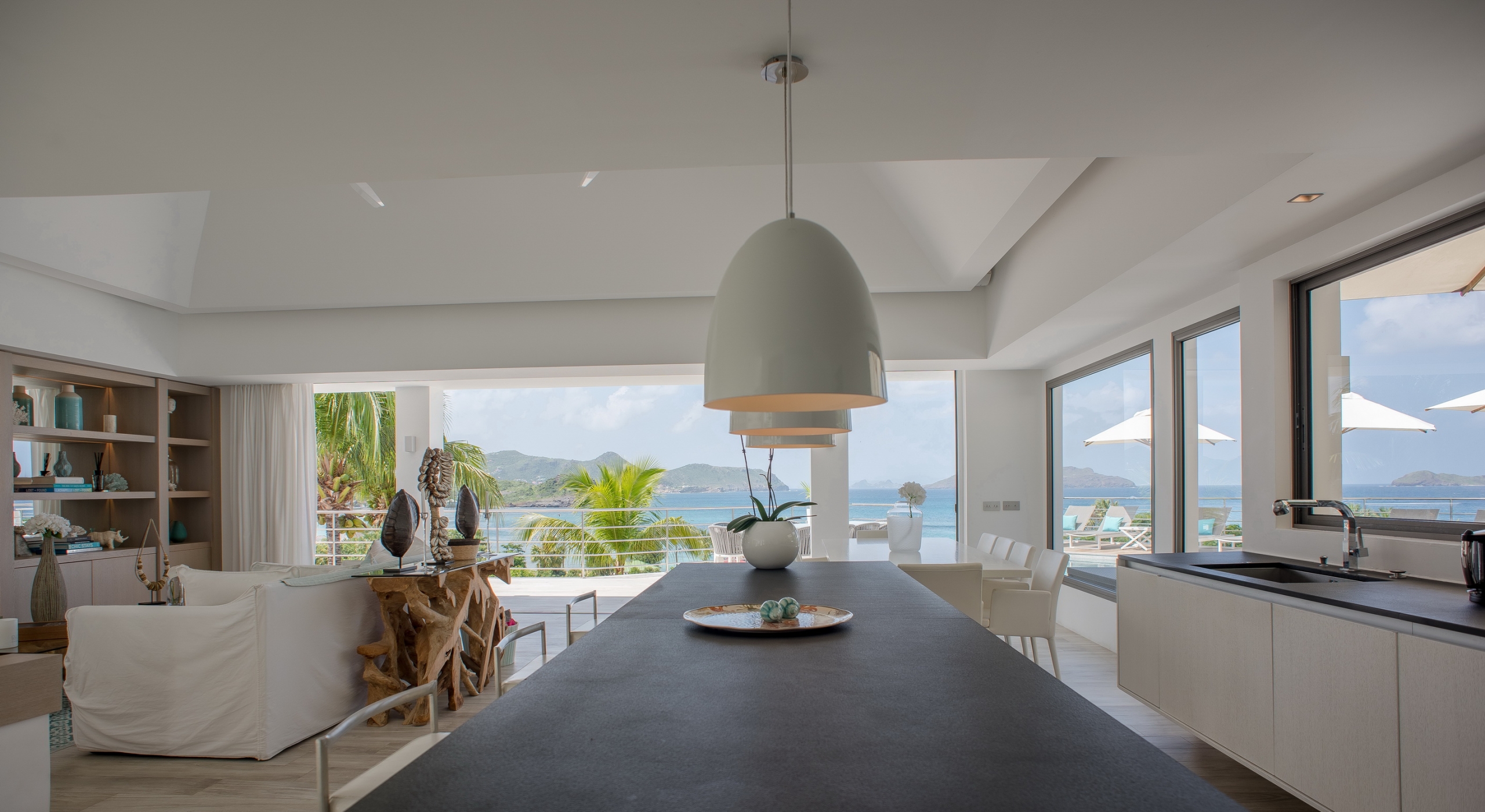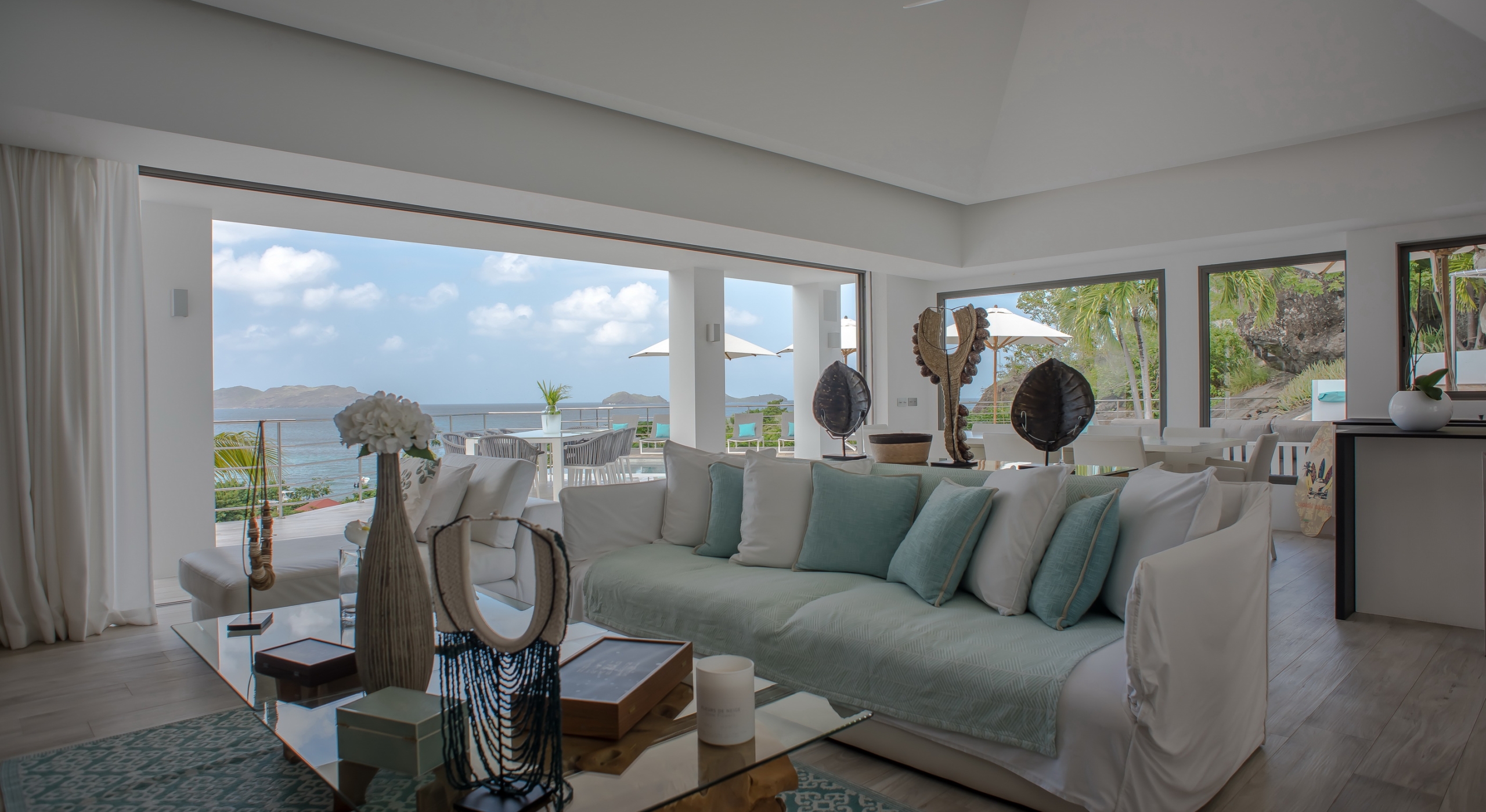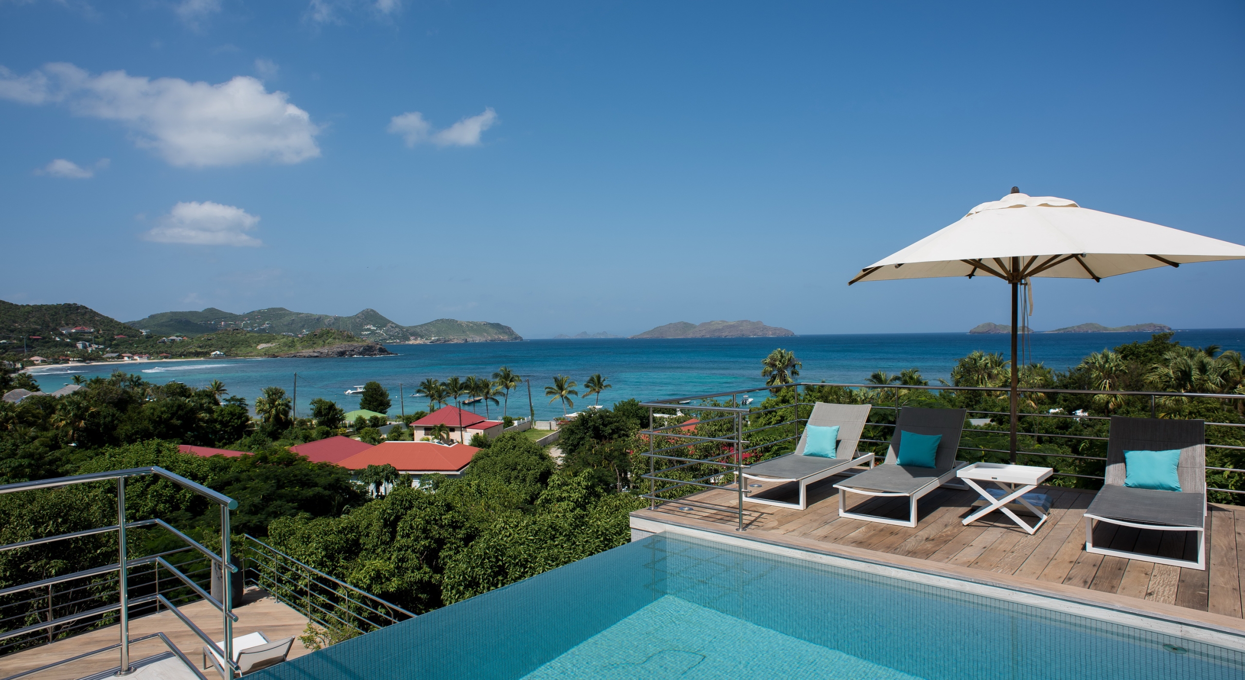 The view on the ocean and Lorient Bay with plenty of different blues is splendid. Its elegant decoration is making this villa a luxury one.