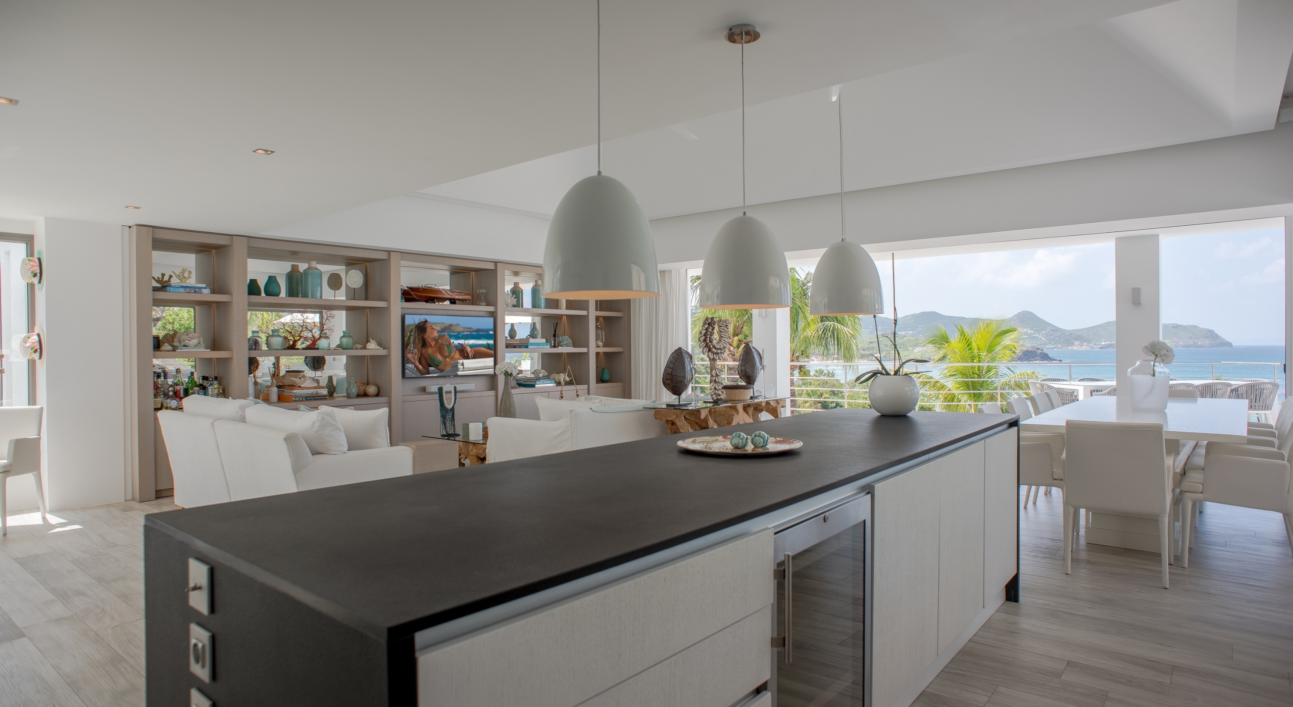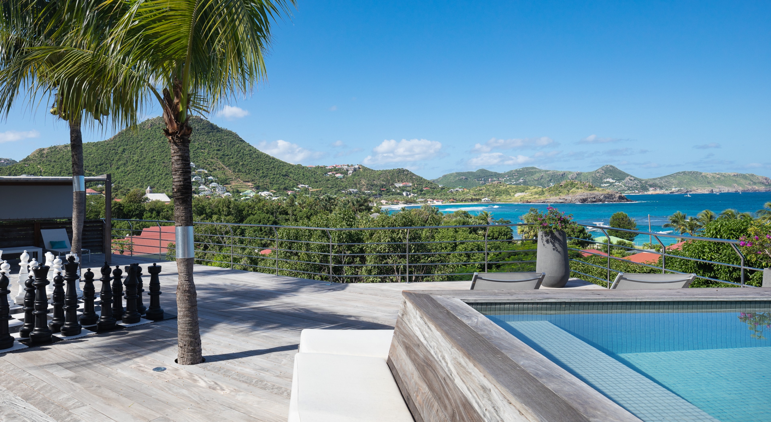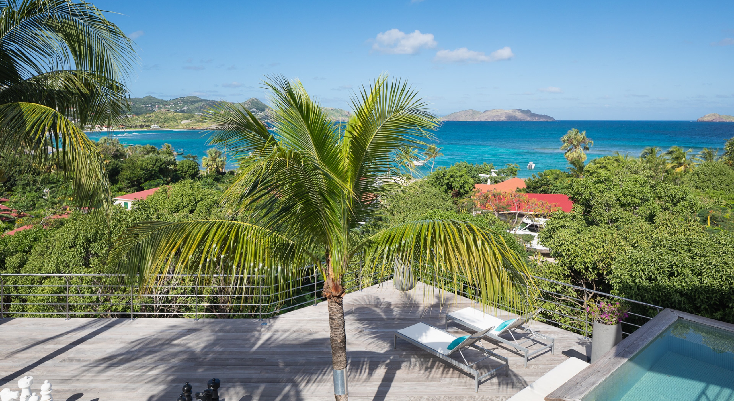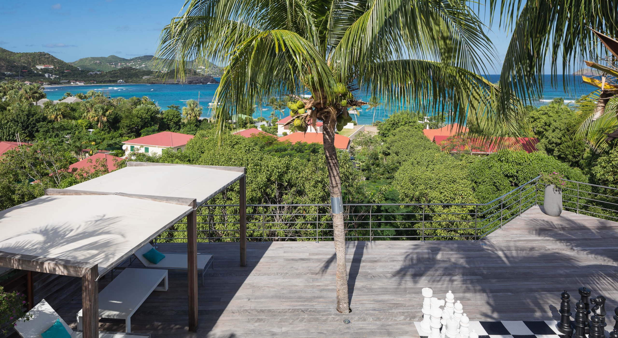 The view on the ocean and Lorient Bay with plenty of different blues is splendid. Its elegant decoration is making this villa a luxury one.