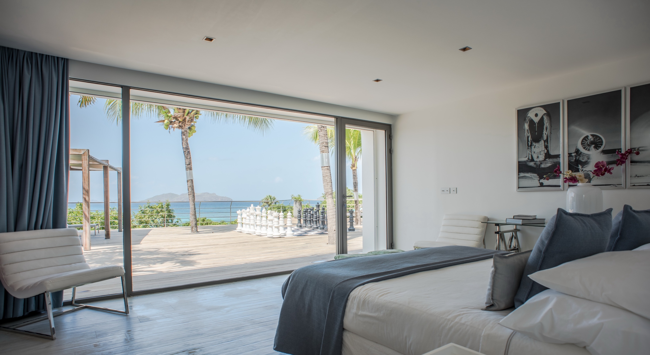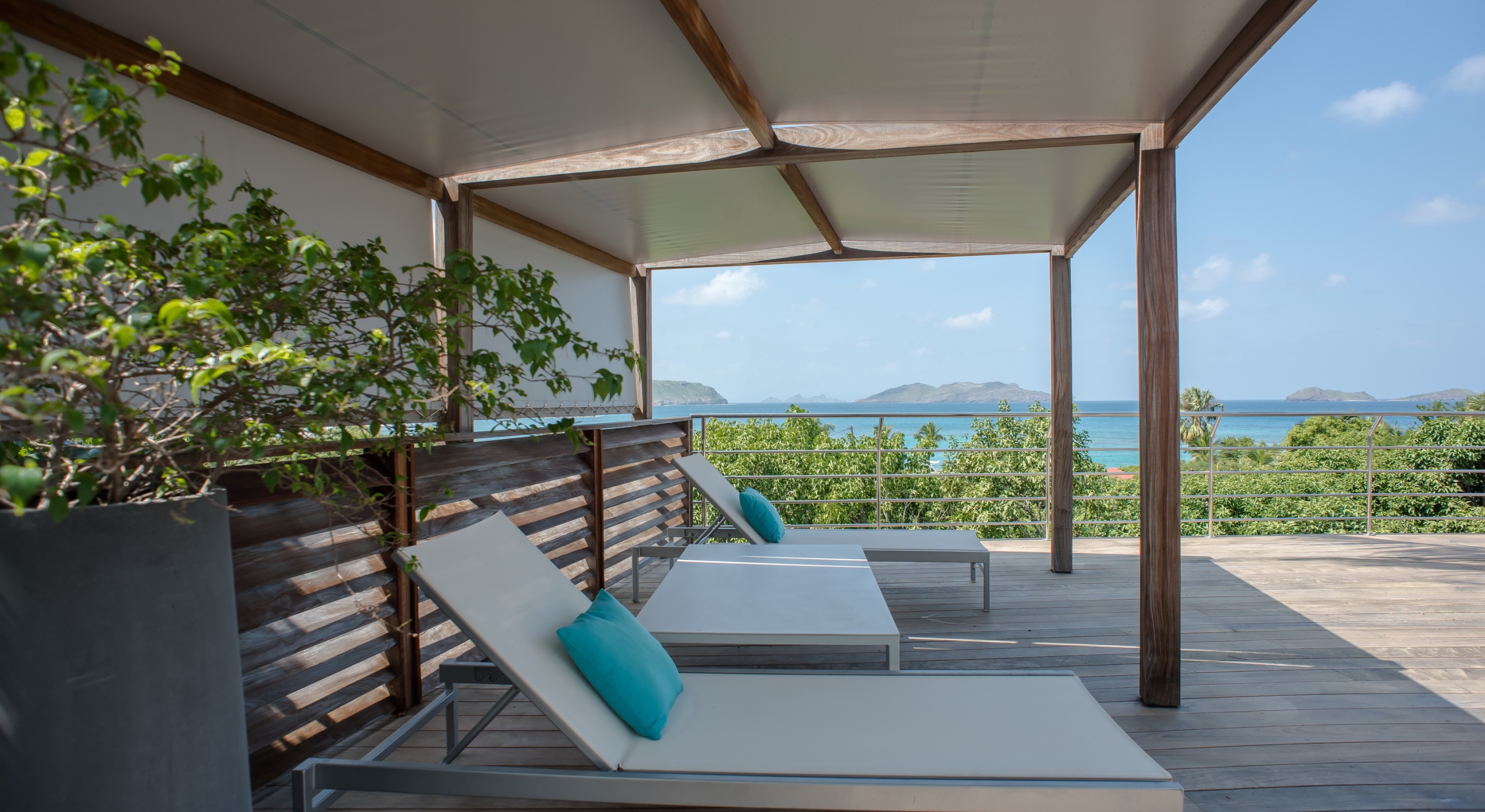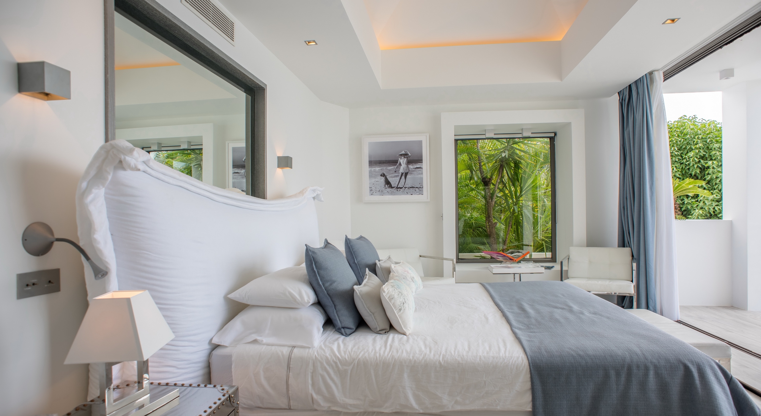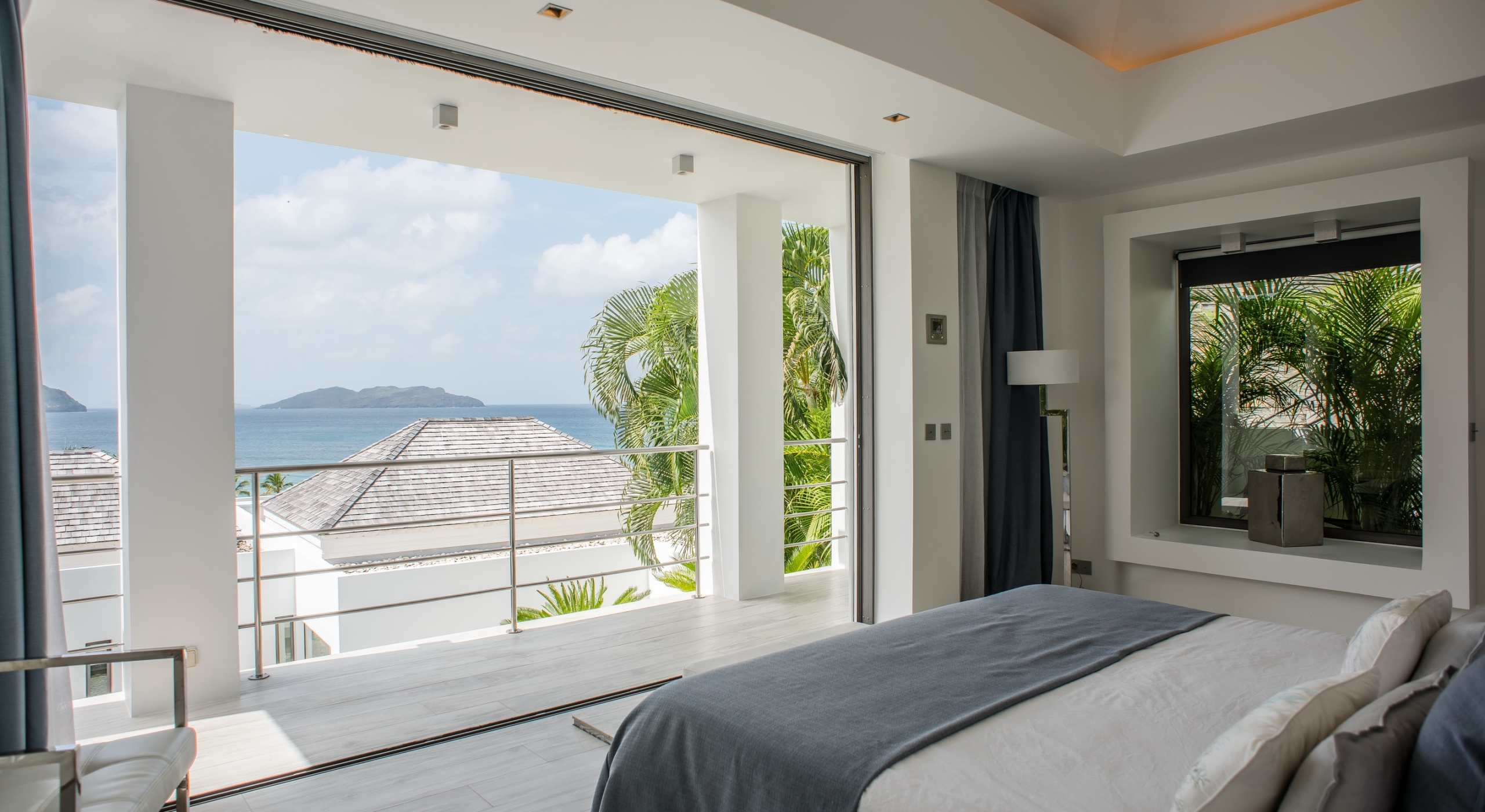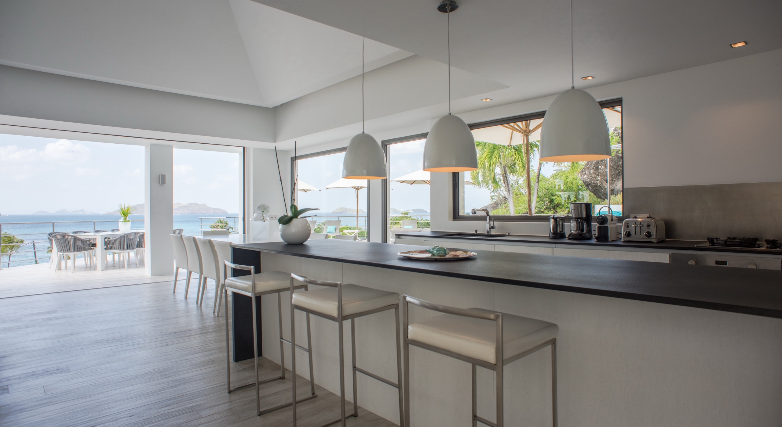 The view on the ocean and Lorient Bay with plenty of different blues is splendid. Its elegant decoration is making this villa a luxury one.