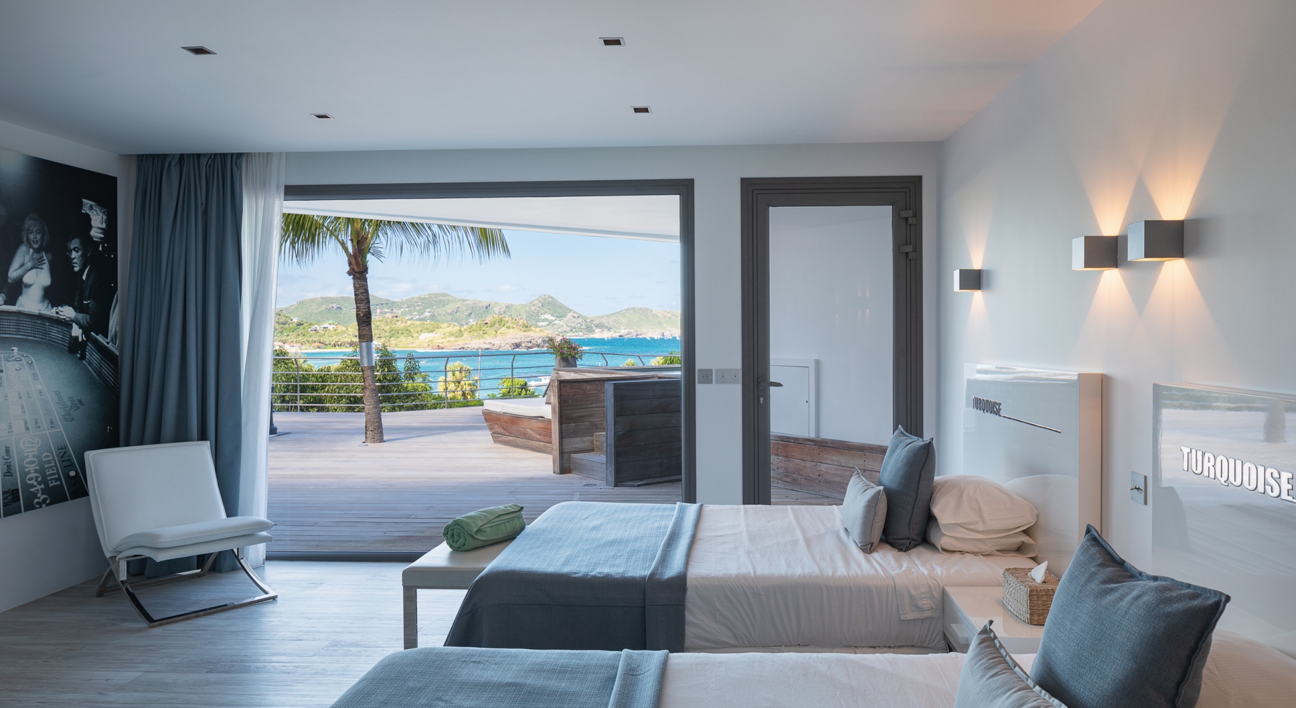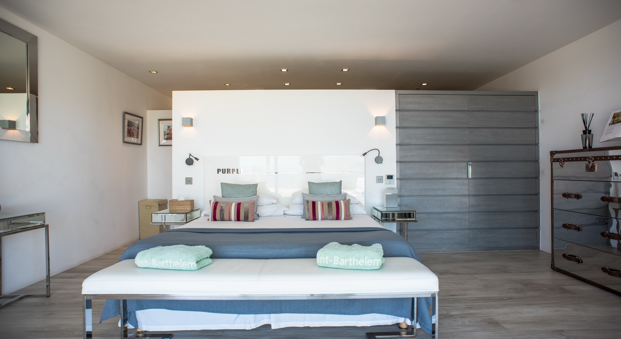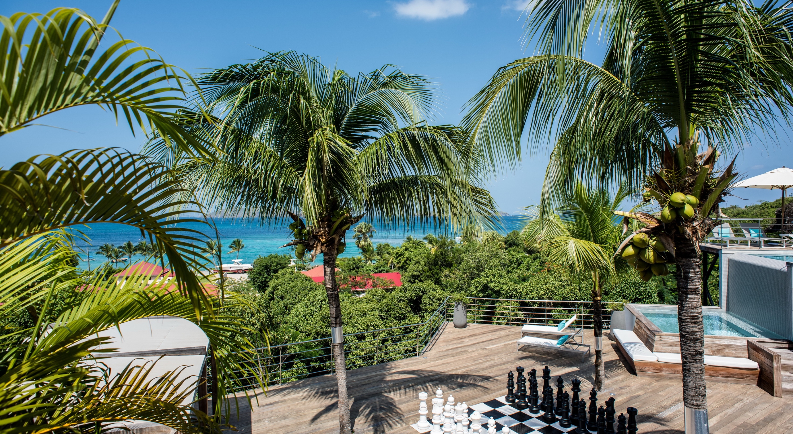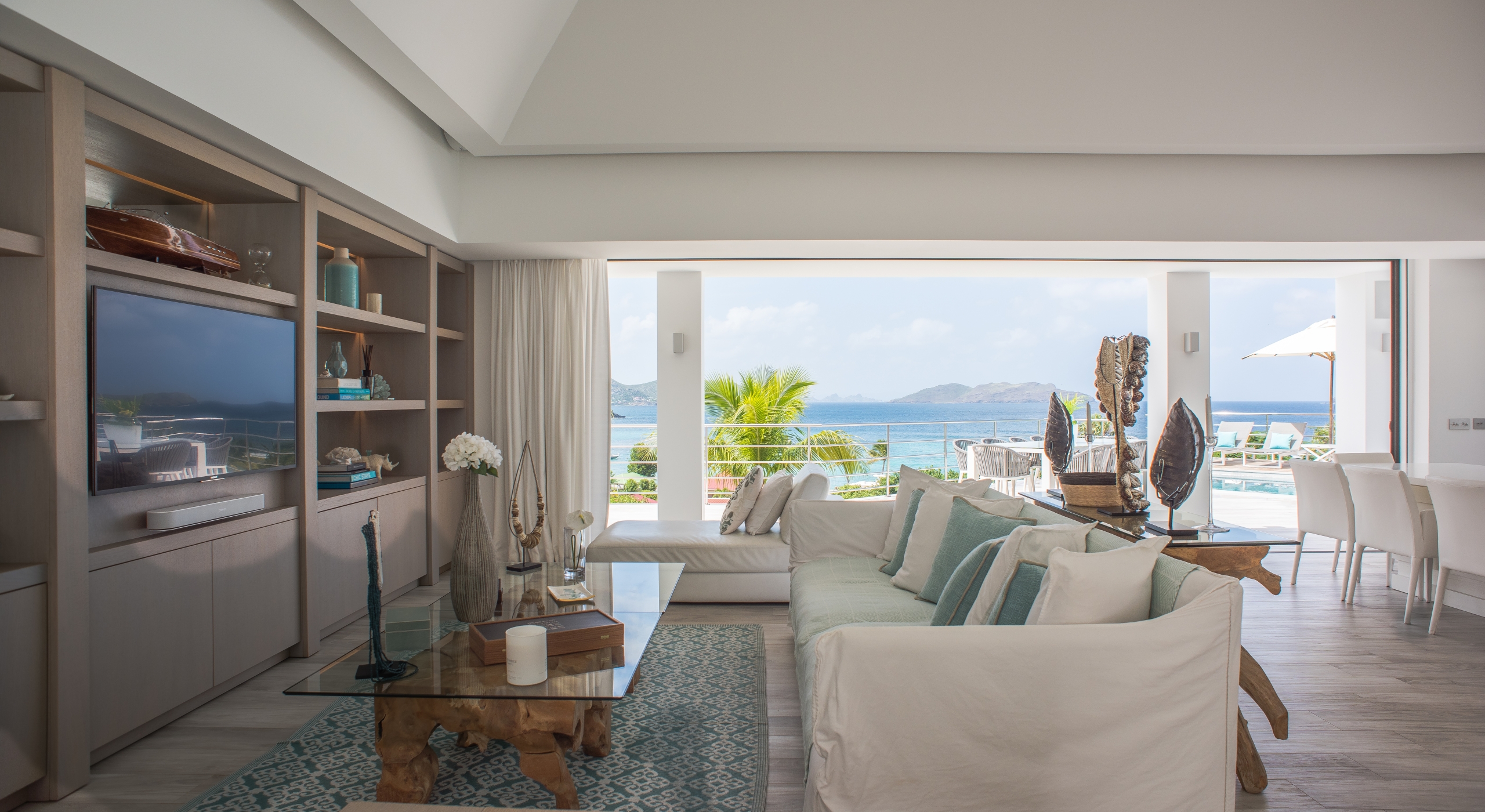 The view on the ocean and Lorient Bay with plenty of different blues is splendid. Its elegant decoration is making this villa a luxury one.